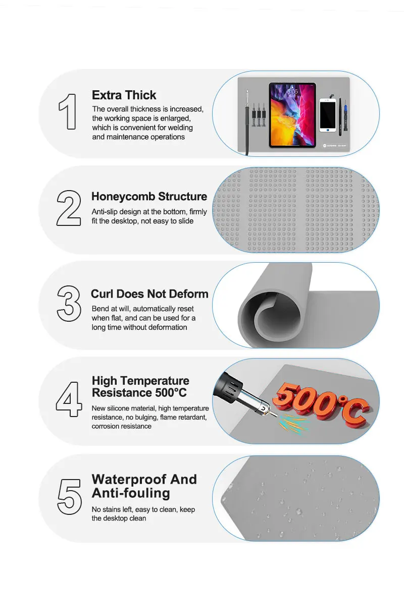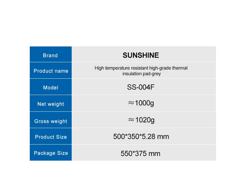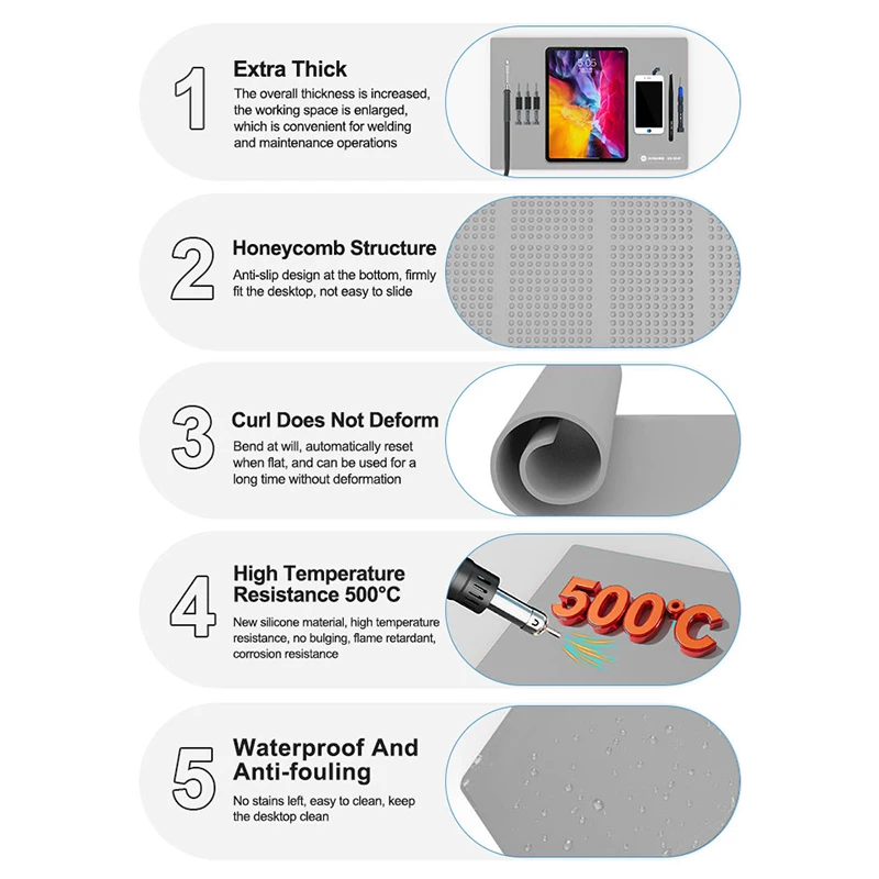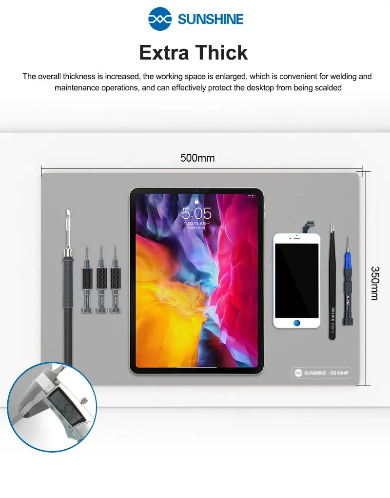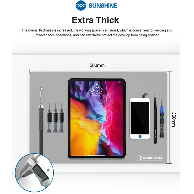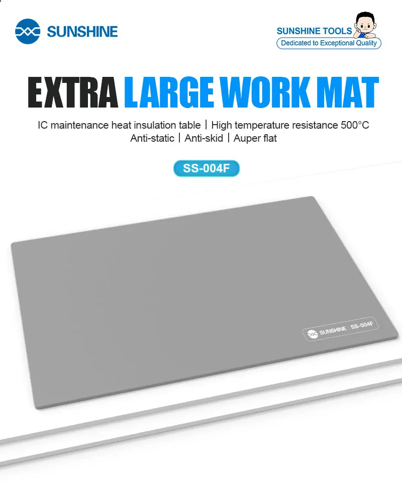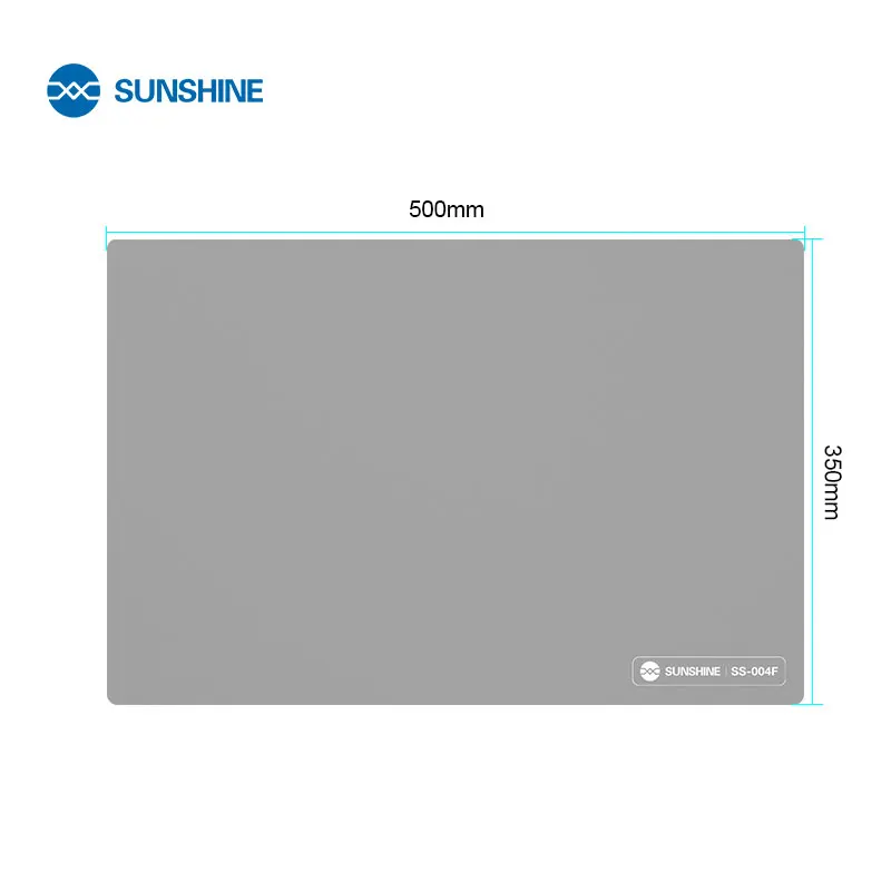 SUNSHINE SS-004F Heat Insulation Silicone Pad Work Mat High Temperature Resistant Repair Pad Extra Lage Work Mat1.Extra Large Work Mat2.IC maintenance heat insulation table / high temperature resistance 500℃ / anti-static / anti-skid / super flat3.High temperature resistant high-grade thermal insulation pad4.Suitable for all kinds of electronic product repair station5.Anti-slip design6.No stains left, easy to clean, keep the desktop clean