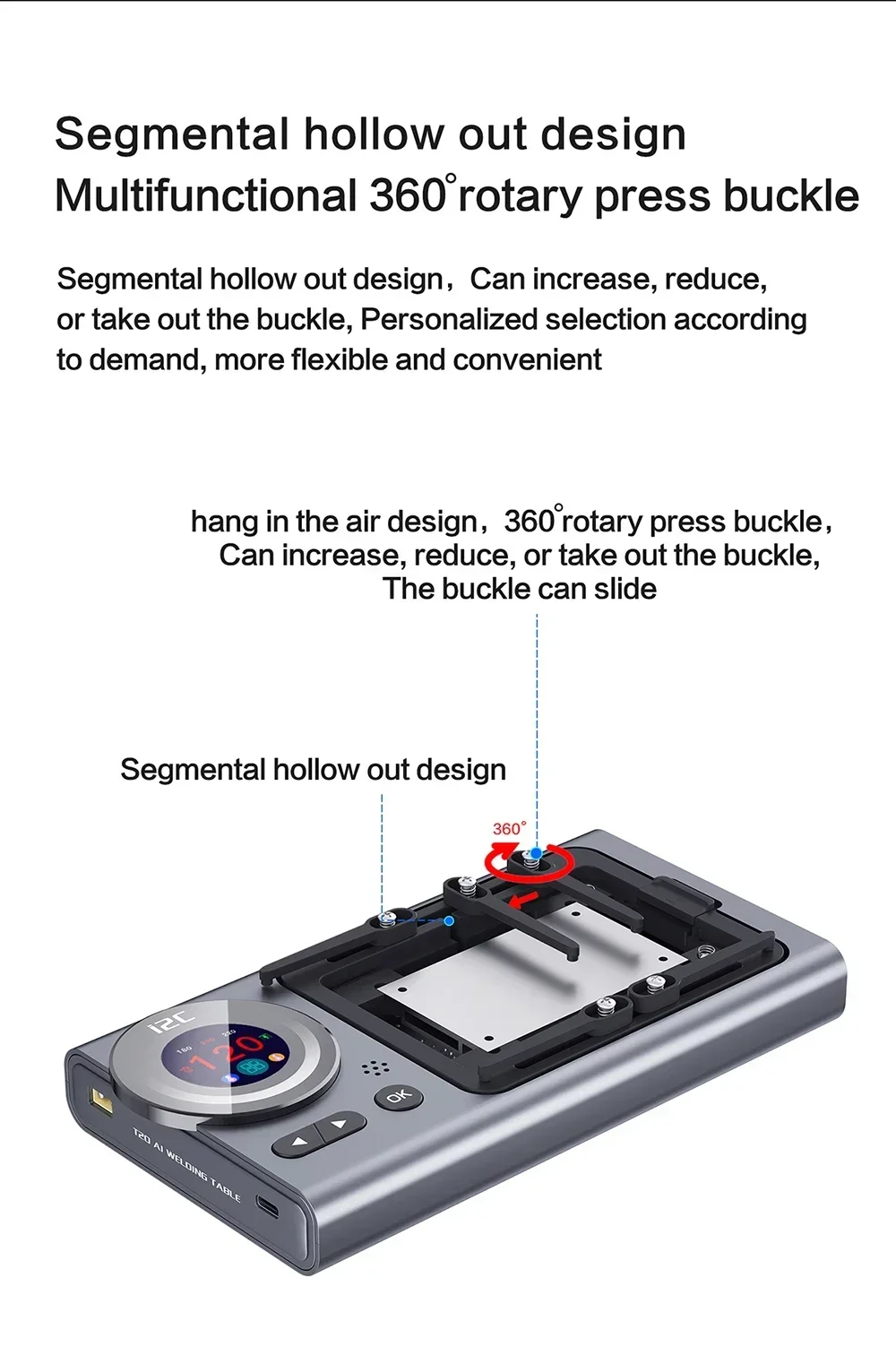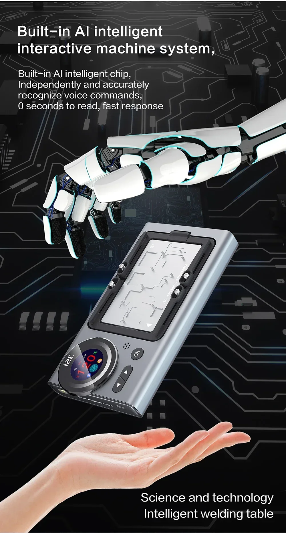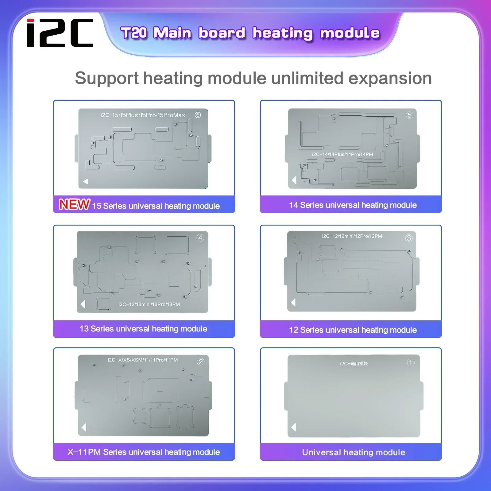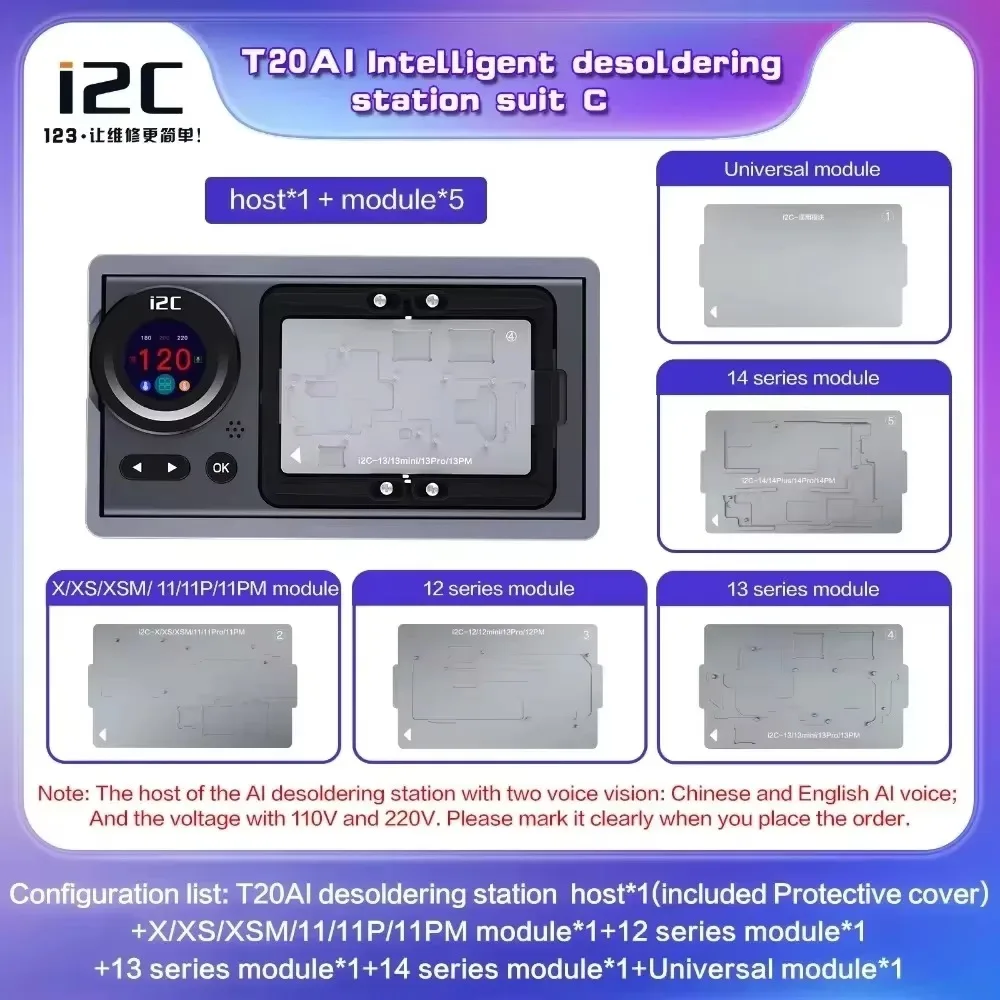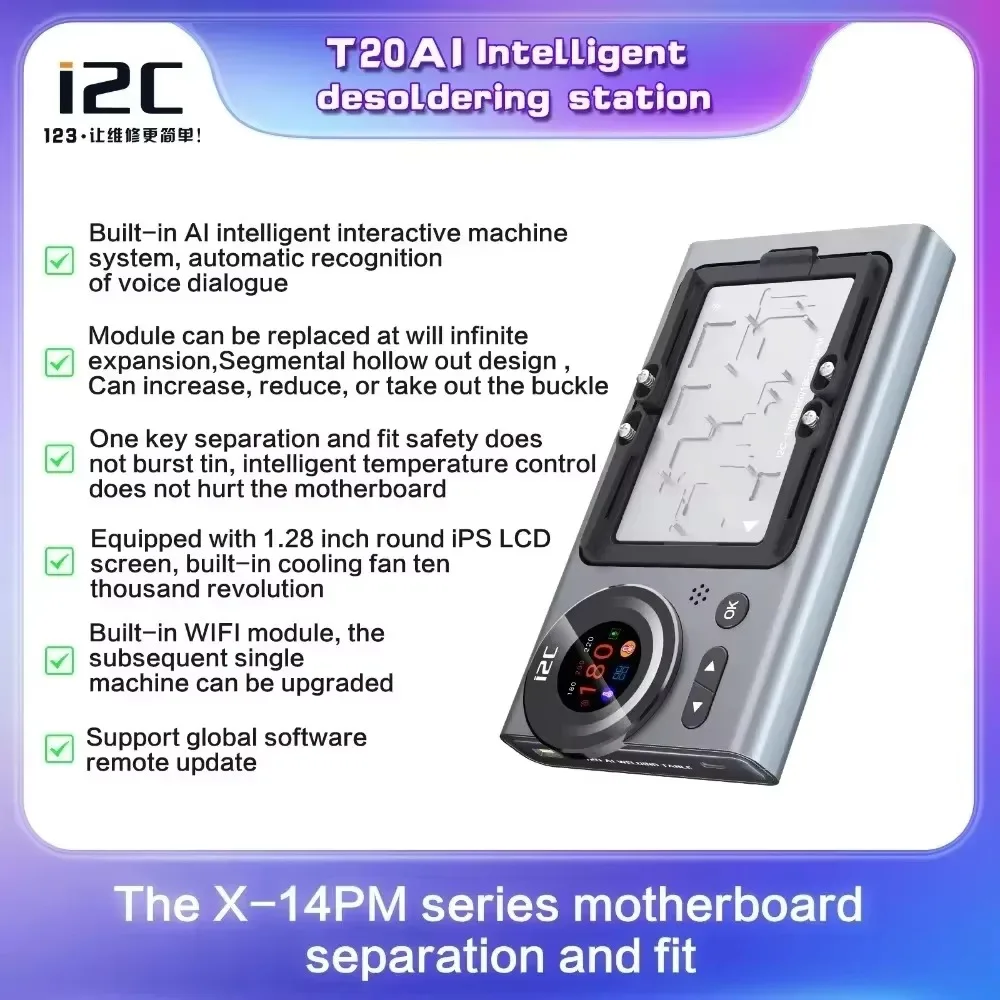 i2C T20 AI Intelligent BGA Desoldering Station For iPhone X-16 Pro Max Description: i2C T20 AI Intelligent Desoldering Station For iPhone X-15 Pro Max Logic Board Desoldering Separating. i2C T20 AI Preheating Separating Platform Is Made for iPhone Android Phone Mainboard PCB/CPU/IC/Face ID Screen Frame Repair Tool. Features: i2C T20 AI Intelligent Desoldering Station Built-in Al intelligent interactive machine system, automatic recognition of voice dialogue. Module can be replaced at will infinite expansion, segmental hollow out design, can increase, reduce, or take out the buckle. One key separation and fit safety does not burst tin intelligent temperature control does not hurt the motherboard. Equipped with 1.28-inch round iPS LCD screen, built-in cooling fan ten thousand revolution. Built-in WIFl module, the subsequent single machine can be upgraded. Support global software remote update. Compatible with the iPhone X/XS/XS Max/11/11 Pro/11 Pro Max/12/12 Mini/12 Pro/12 Pro Max/13/13 Mini/13 Pro/13 Pro Max/14/14 Plus/14 Pro/14 Pro Max +added 15 plus 15 pro max. i2C T20 AI Desoldering Station Package A Includes: 1x i2C T20 AI Host 1x Universal Module 1x Power Cord i2C T20 AI Desoldering Station Package B Includes: 1x i2C T20 AI Host 1x iPhone X-11 series heating mold 1x iPhone 12/12P/12PM/12mini heating mold 1x iPhone 13/13/13PM/13mini heating mold 1x Power Cord i2C T20 AI Desoldering Station Package C Full Set Includes: 1x i2C T20 AI Host 1x Universal Module 1x iPhone X-11 series heating mold 1x iPhone 12/12P/12PM/12mini heating mold 1x iPhone 13/13/13PM/13mini heating mold 1x iPhone 14 series heating mold 1x Power Cord