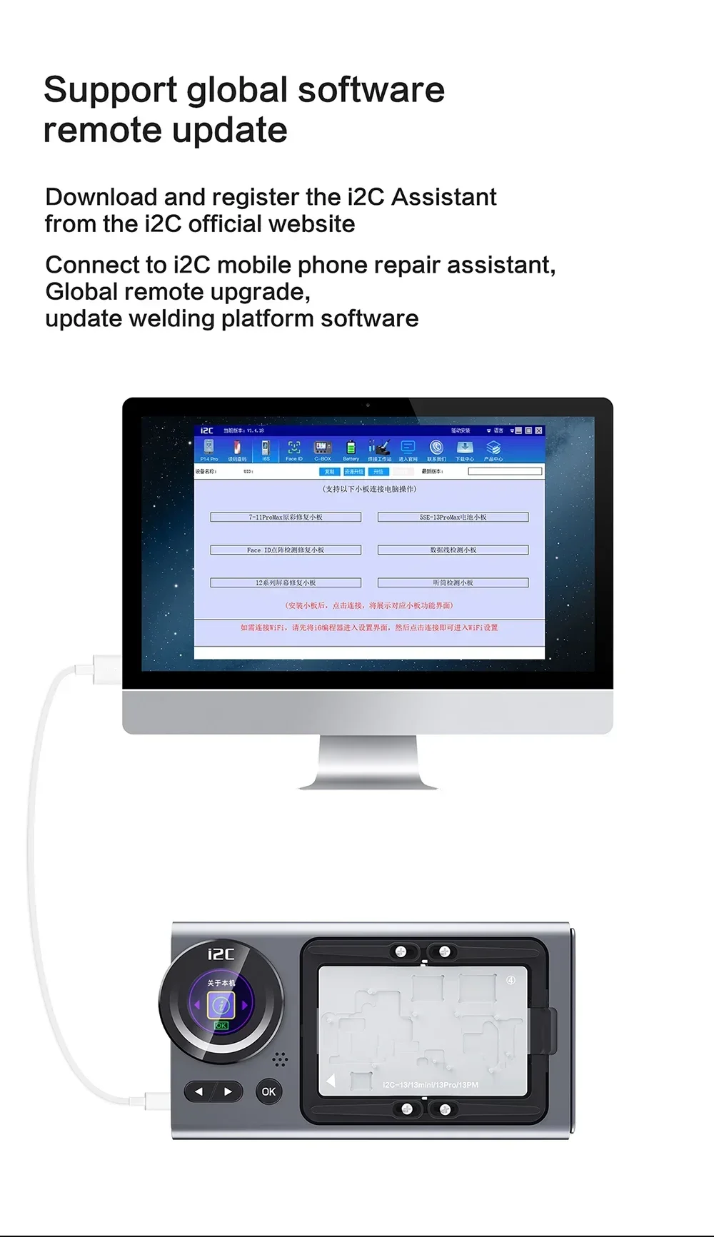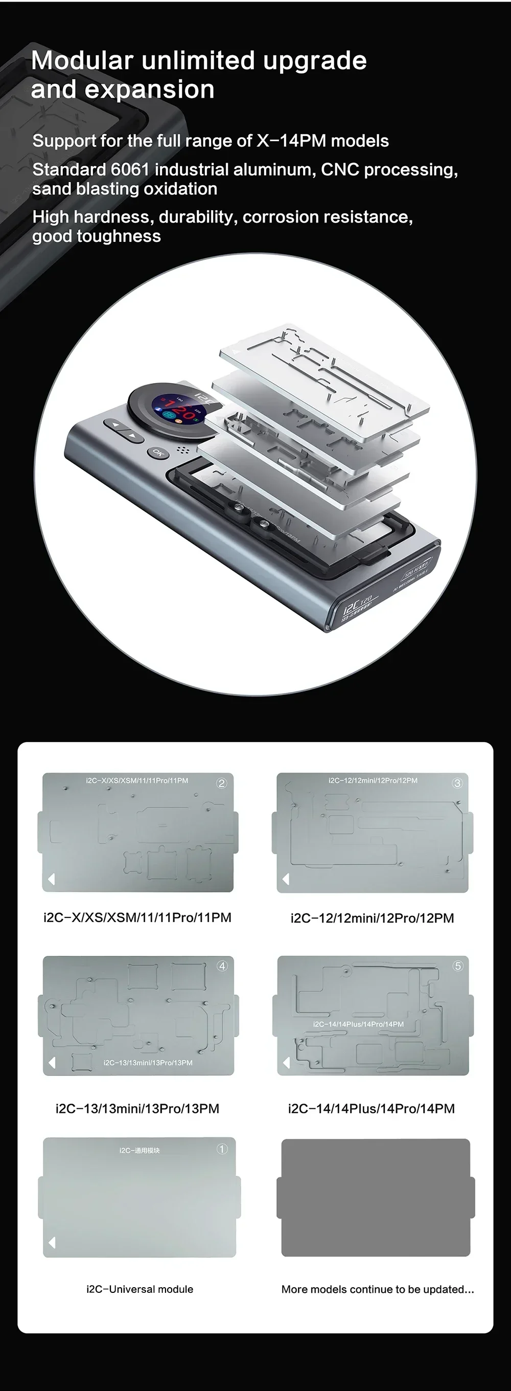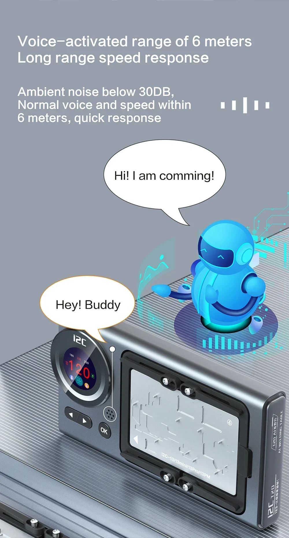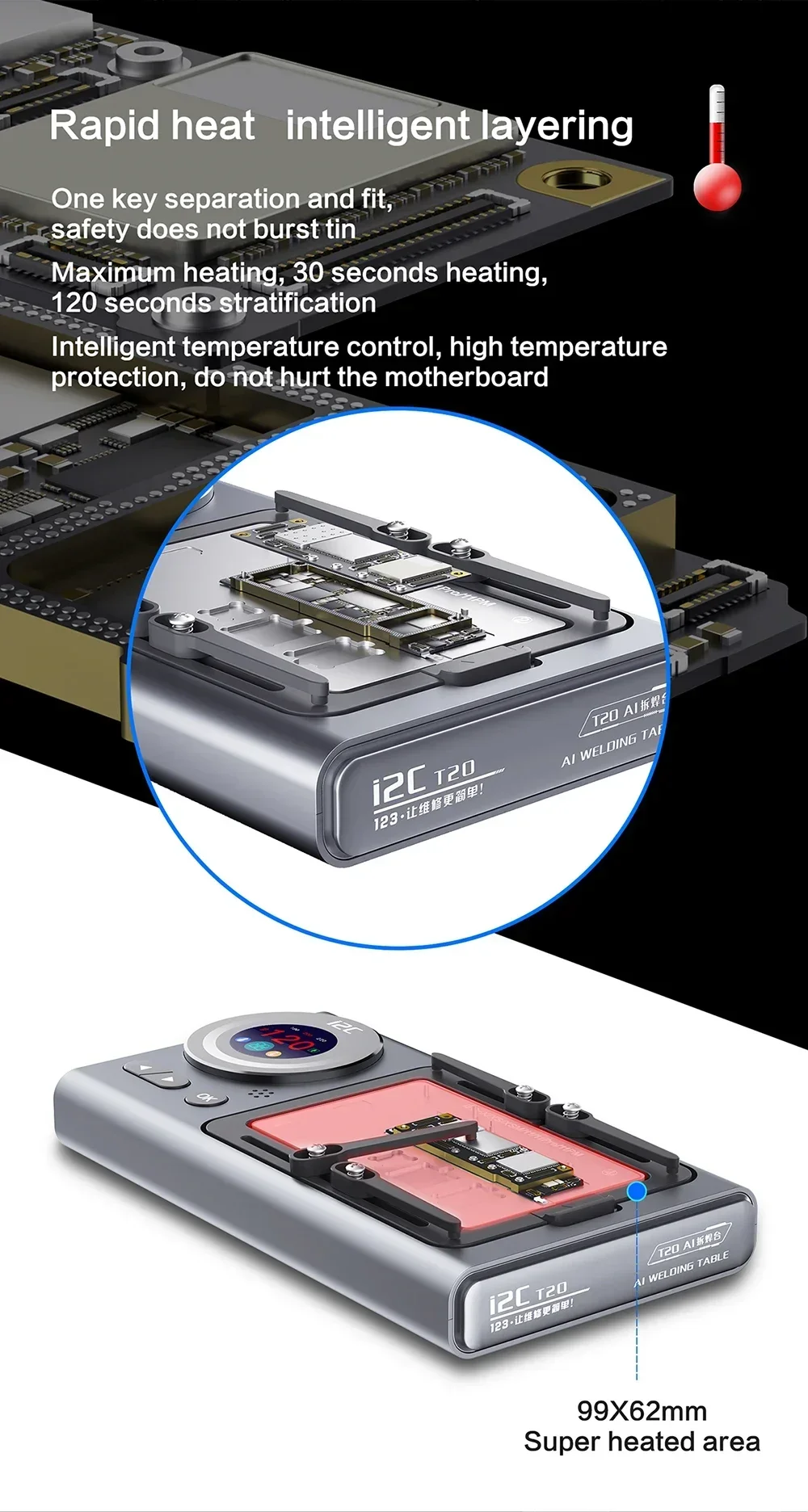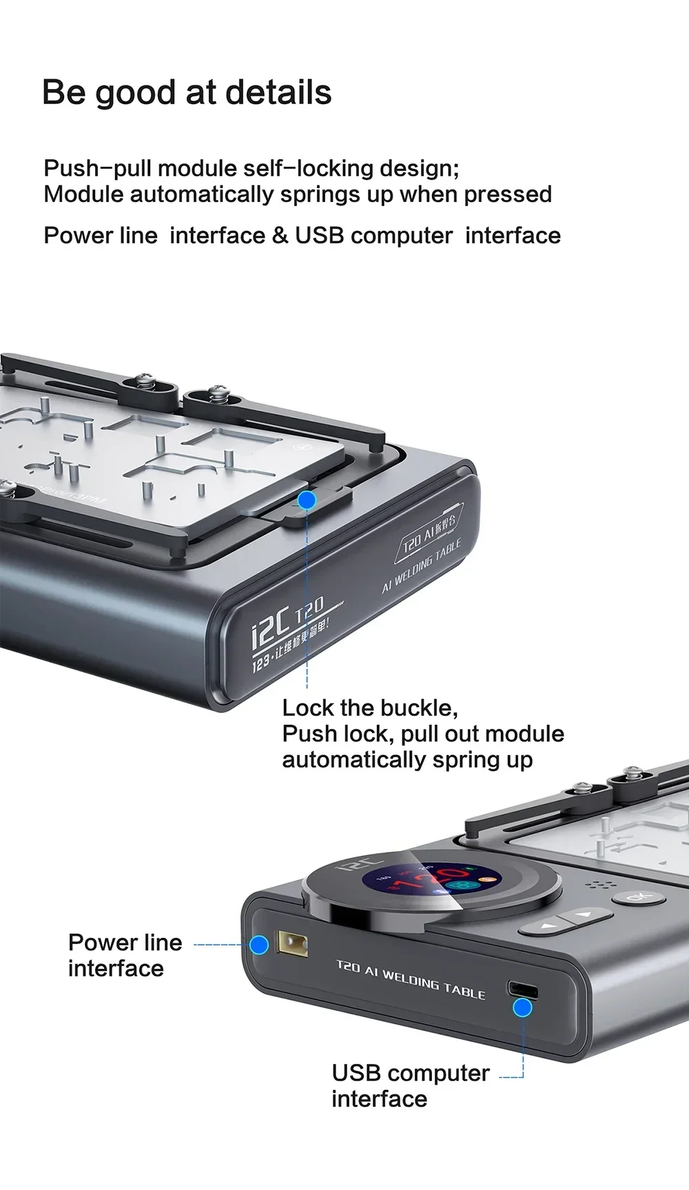 i2C T20 AI Intelligent BGA Desoldering Station For iPhone X-16 Pro Max Description: i2C T20 AI Intelligent Desoldering Station For iPhone X-15 Pro Max Logic Board Desoldering Separating. i2C T20 AI Preheating Separating Platform Is Made for iPhone Android Phone Mainboard PCB/CPU/IC/Face ID Screen Frame Repair Tool. Features: i2C T20 AI Intelligent Desoldering Station Built-in Al intelligent interactive machine system, automatic recognition of voice dialogue. Module can be replaced at will infinite expansion, segmental hollow out design, can increase, reduce, or take out the buckle. One key separation and fit safety does not burst tin intelligent temperature control does not hurt the motherboard. Equipped with 1.28-inch round iPS LCD screen, built-in cooling fan ten thousand revolution. Built-in WIFl module, the subsequent single machine can be upgraded. Support global software remote update. Compatible with the iPhone X/XS/XS Max/11/11 Pro/11 Pro Max/12/12 Mini/12 Pro/12 Pro Max/13/13 Mini/13 Pro/13 Pro Max/14/14 Plus/14 Pro/14 Pro Max +added 15 plus 15 pro max. i2C T20 AI Desoldering Station Package A Includes: 1x i2C T20 AI Host 1x Universal Module 1x Power Cord i2C T20 AI Desoldering Station Package B Includes: 1x i2C T20 AI Host 1x iPhone X-11 series heating mold 1x iPhone 12/12P/12PM/12mini heating mold 1x iPhone 13/13/13PM/13mini heating mold 1x Power Cord i2C T20 AI Desoldering Station Package C Full Set Includes: 1x i2C T20 AI Host 1x Universal Module 1x iPhone X-11 series heating mold 1x iPhone 12/12P/12PM/12mini heating mold 1x iPhone 13/13/13PM/13mini heating mold 1x iPhone 14 series heating mold 1x Power Cord
