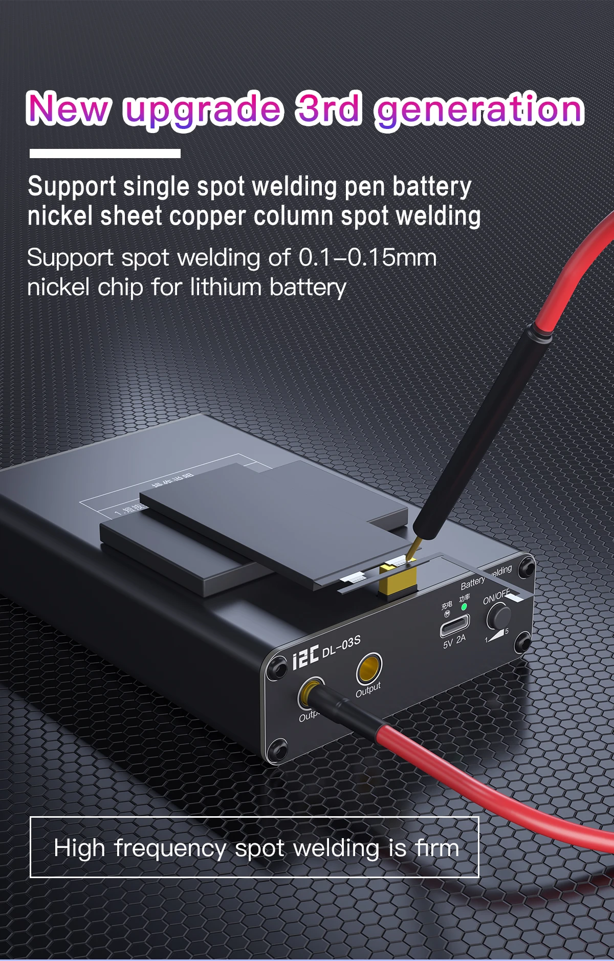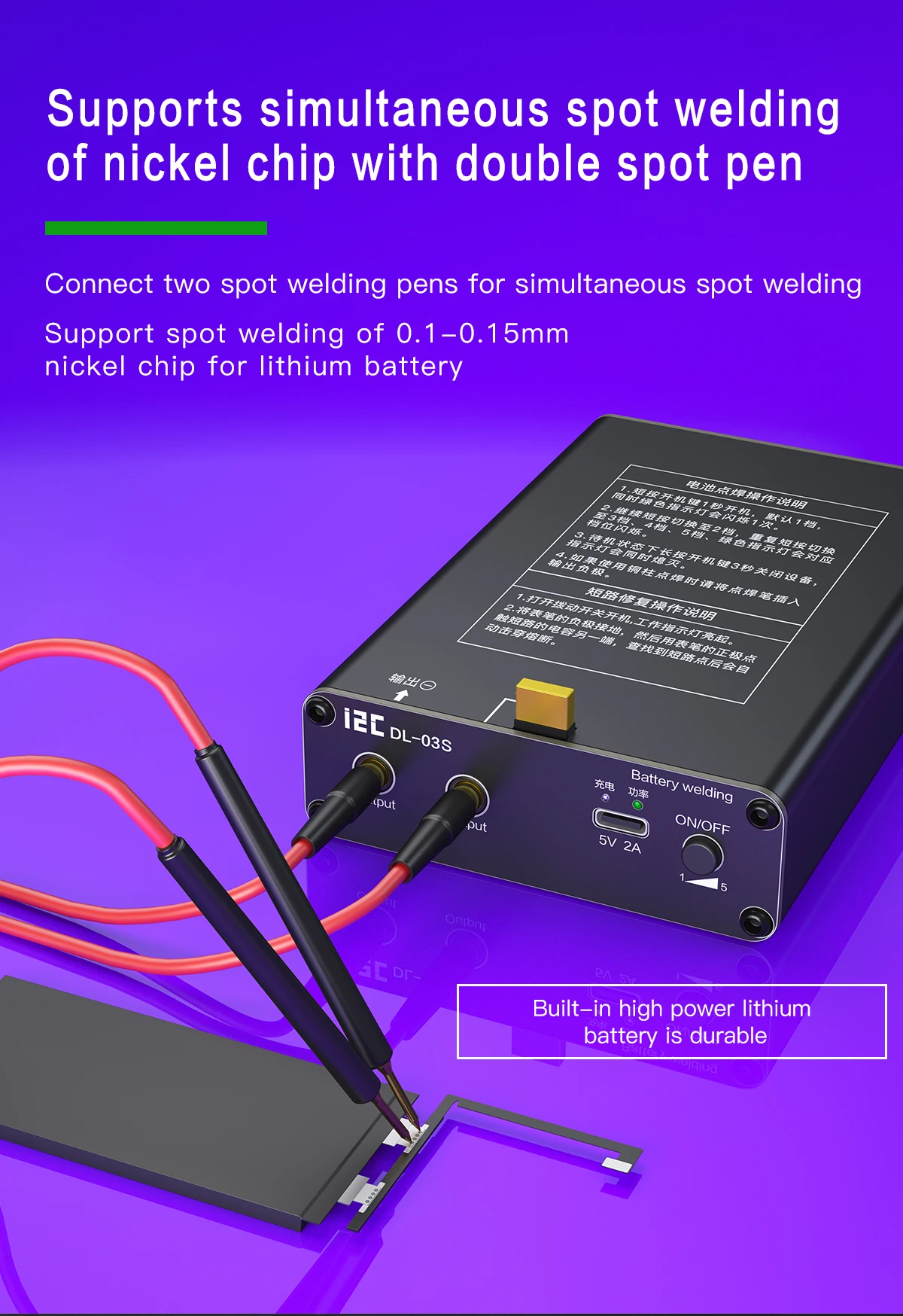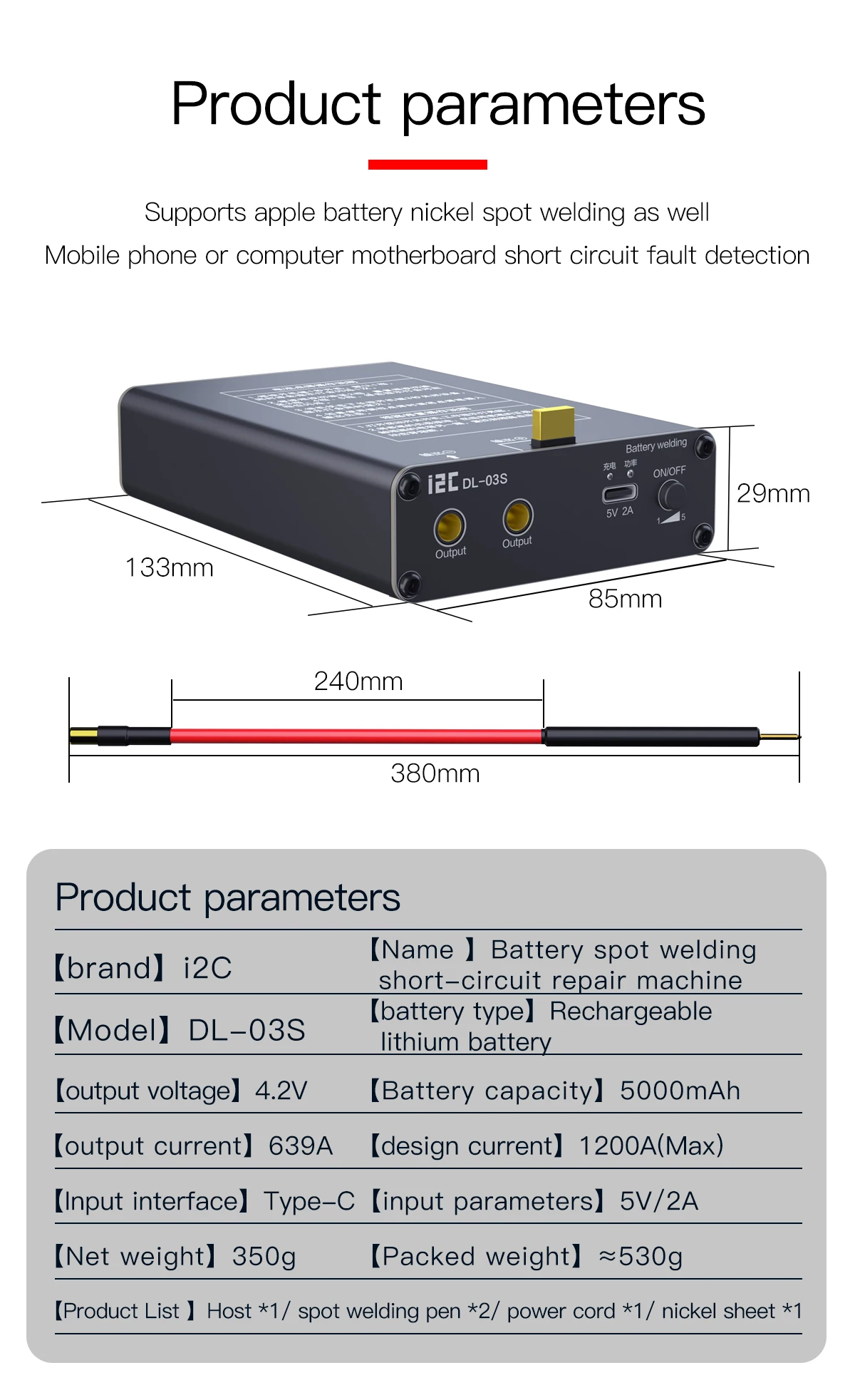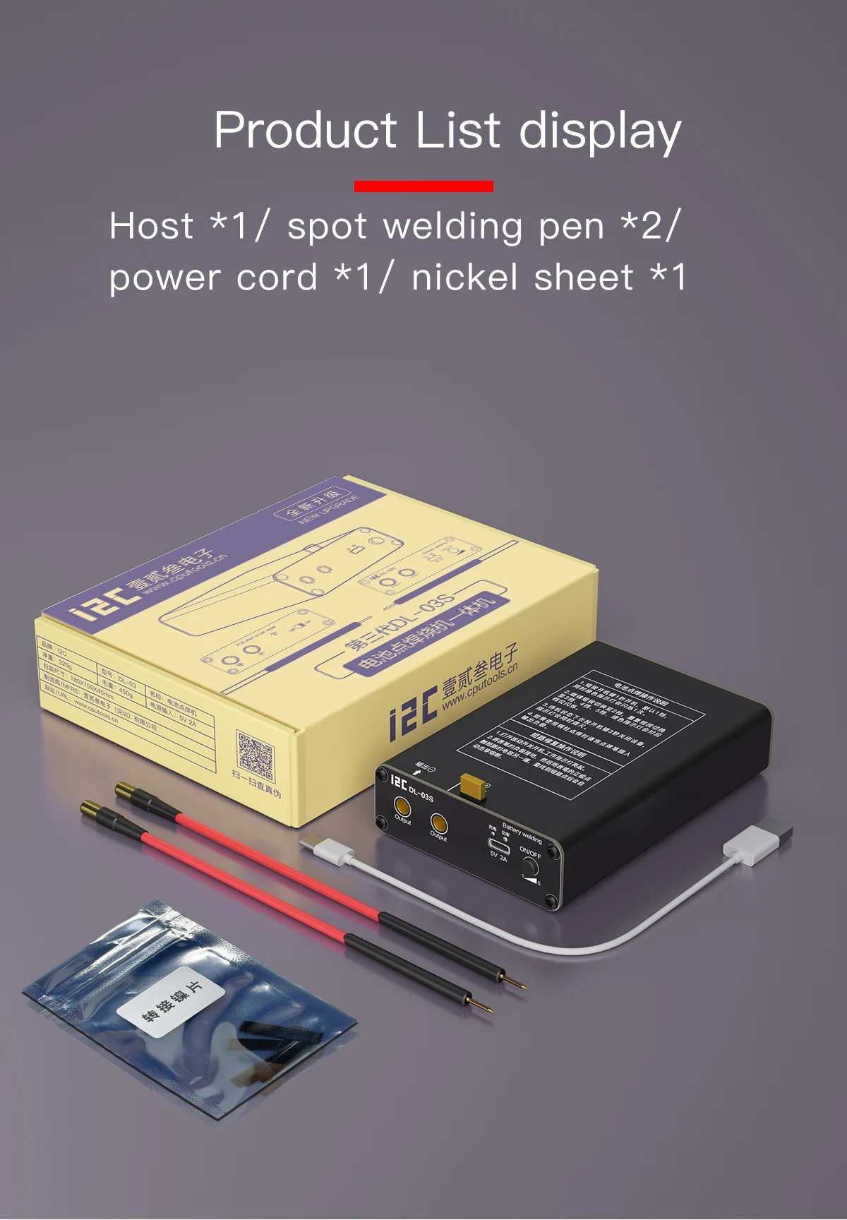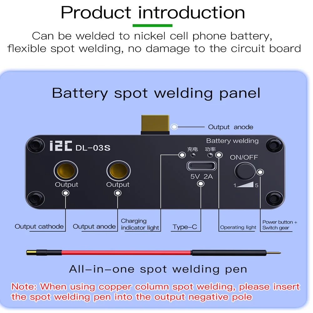 I2C DL-03S Spot Welder 5 Gears Mini Spot Welding Machine Mobile Phone Short Circuit Repair Instrument 18650 Battery Welding ToolPacking&shippingPacking Details : Packed in wooden cases/carton boxDelivery time : Within 5 days after received the paymentShipping: DHL,FEDEX,EMS,TNT and Shipping etc.Please contact us for latest freight.FAQQ: Are you a trading company or a manufacturer?A: We are an integration of industry and trade.Q: What types of products do you mainly produce?A: OCA laminating machine, laser separator, LCD separator and other maintenance accessories, etc.Q: How long is your delivery time?A: Generally it is 3-5 days if the goods are in stock.Q: Do you provide samples? Is it free or extra?A: There are currently no free samples.Q: Will I receive training in LCD repair techniques and machine operation?Answer: Yes, of course. We have detailed videos and can teach online.Q: How many years of warranty does my machine have?Answer: 1 year, during the warranty period, we send spare parts for free.Q: Where can I buy LCD screen renovation materials?A: We provide all materials needed for LCD renovation with guaranteed quality.Q: You have too many machines, how do I know which one I need to buy?A: Please tell us how many LCD screens you need to renovate every day (your detailed needs), and we will provide you with a suitable solution. Or let us know your budget and we'll be happy to help. We have a variety of solutions for different needs. We don't just build machines, most importantly, we provide solutions.