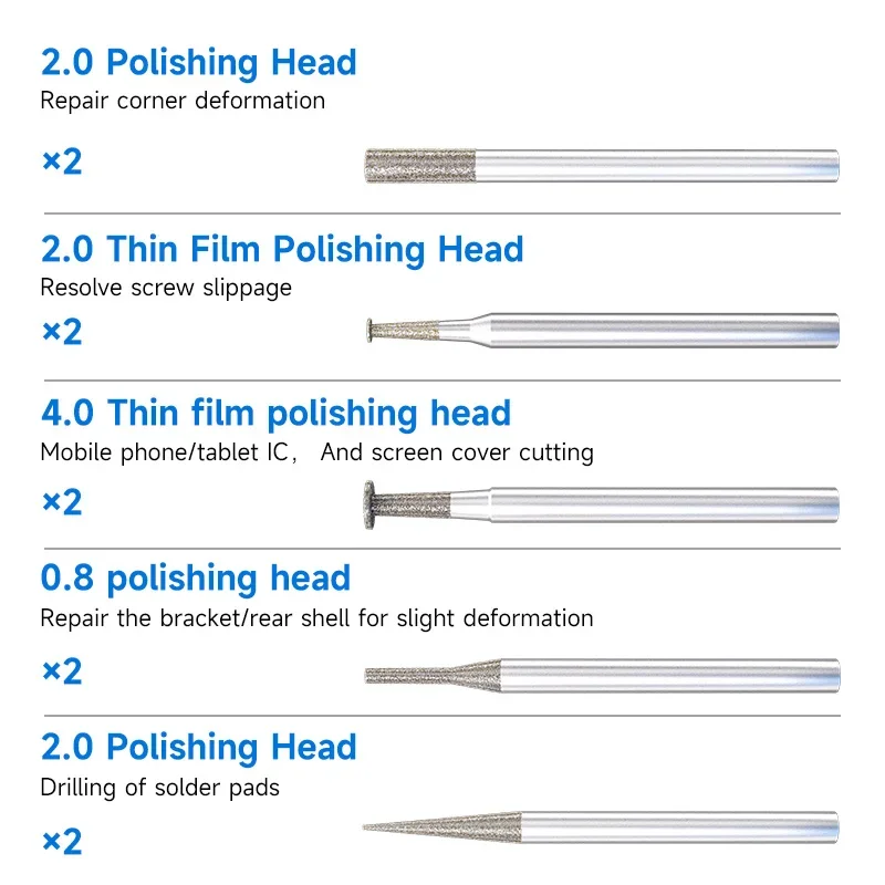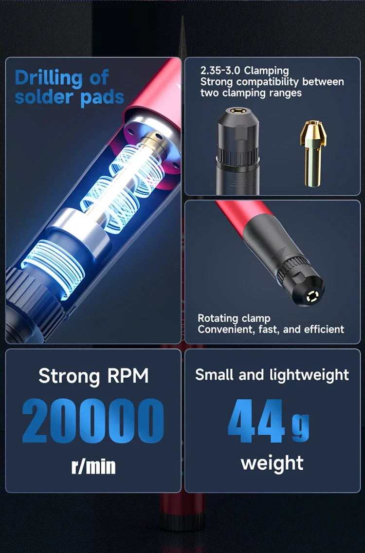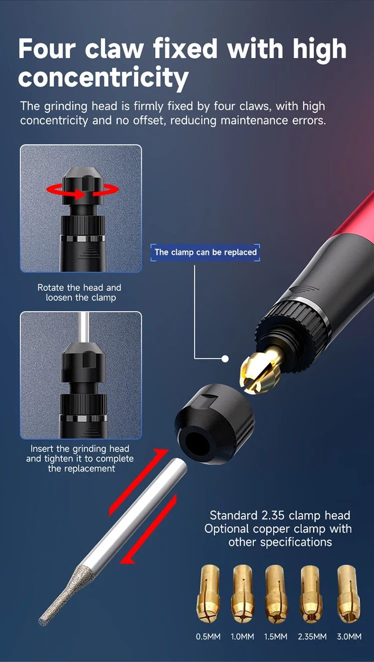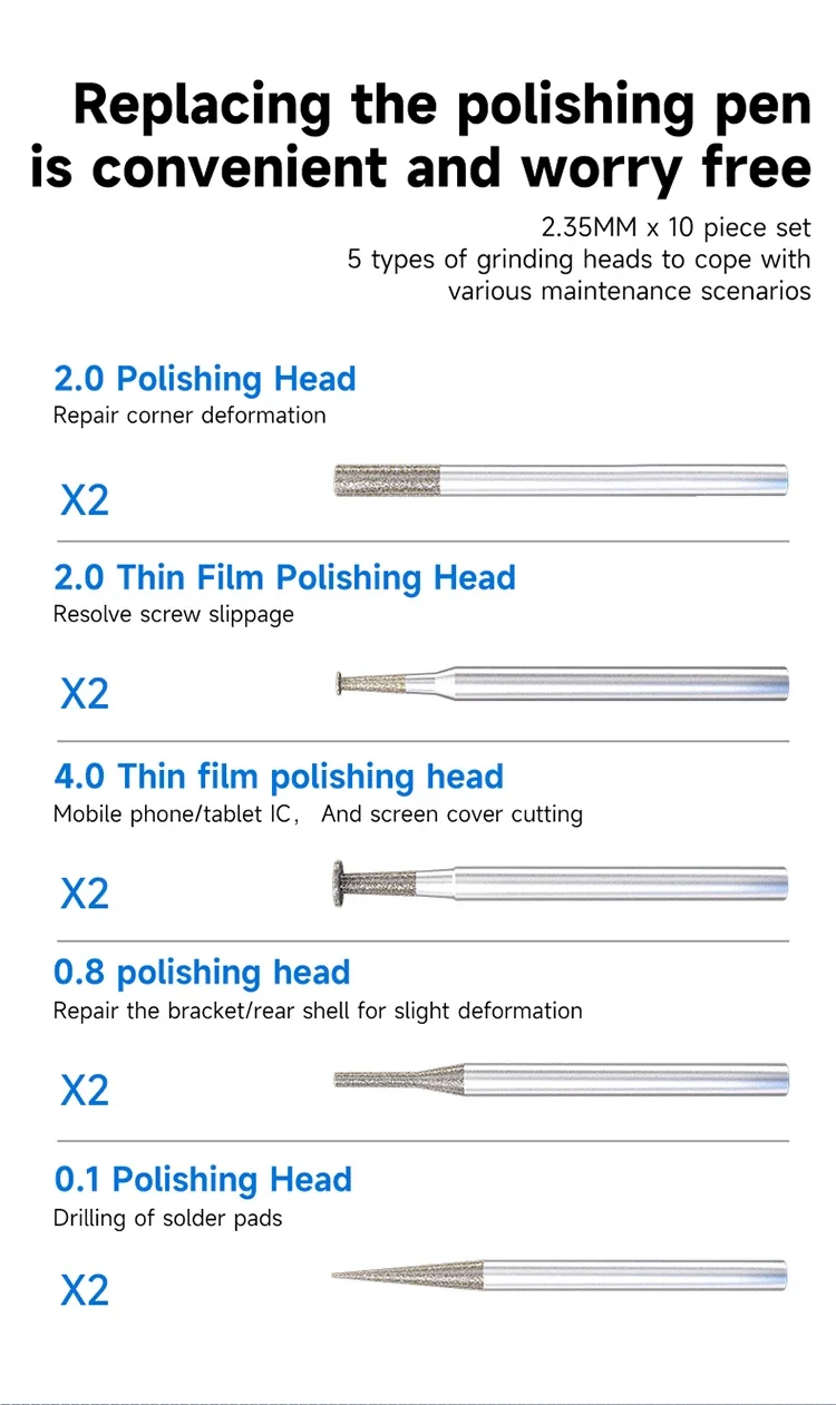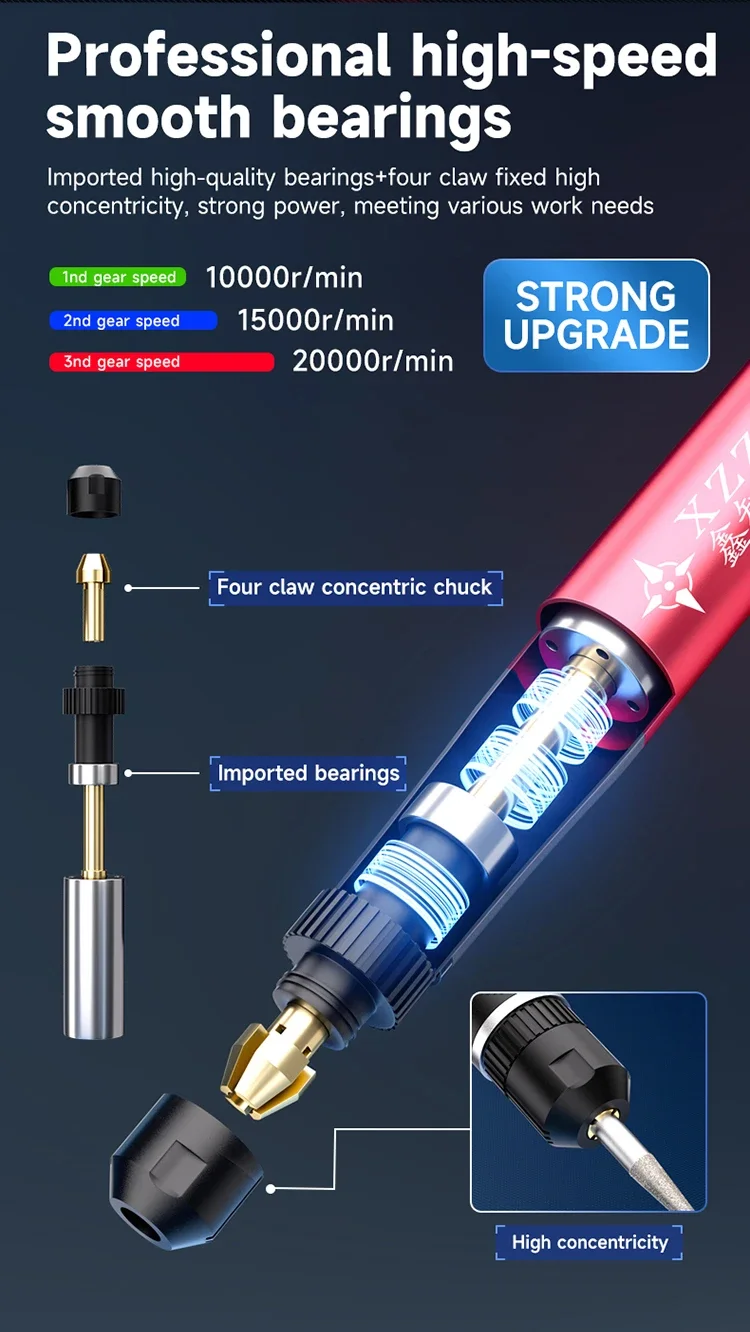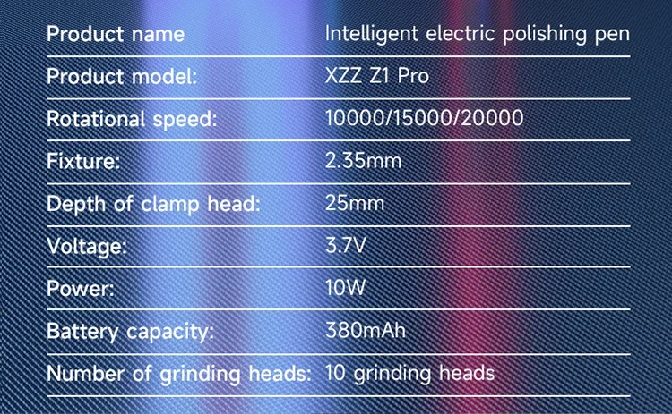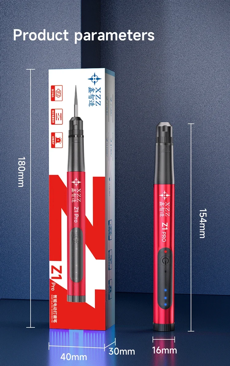 XZZ Z1 Pro – The Ultimate Precision Polishing PenThe Z1 Pro Electric Polishing Pen delivers professional-grade performance with 20,000 RPM speed, interchangeable heads, and smart controls. Designed for electronics repair, jewelry making, and precision grinding, it combines power and finesse in a pocket-sized tool.Key Features: 3-Speed Control – Adjust between 10K/15K/20K RPM for versatile tasks. Quick-Change Chuck – Swap 0.1mm-4.0mm heads in seconds (includes 10 heads). Smart Display – LED indicators for battery life, speed, and overload protection. Type-C Fast Charging – Universal charging port (like Android phones). High-Concentricity Design – Four-claw chuck prevents wobbling for precision work.Applications:PCB Repair: Drill solder pads, polish IC pins.Phone Repair: Cut screen covers, fix deformed frames.Jewelry/Crafts: Detail grinding, metal polishing.Why Choose Z1 Pro?Ergonomic: 44g weight reduces hand fatigue.Safe: Auto-shutoff for overload protection.Pro-Grade: Imported bearings for smooth, durable operation.