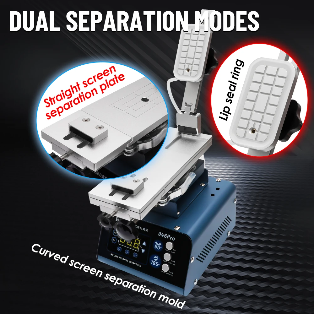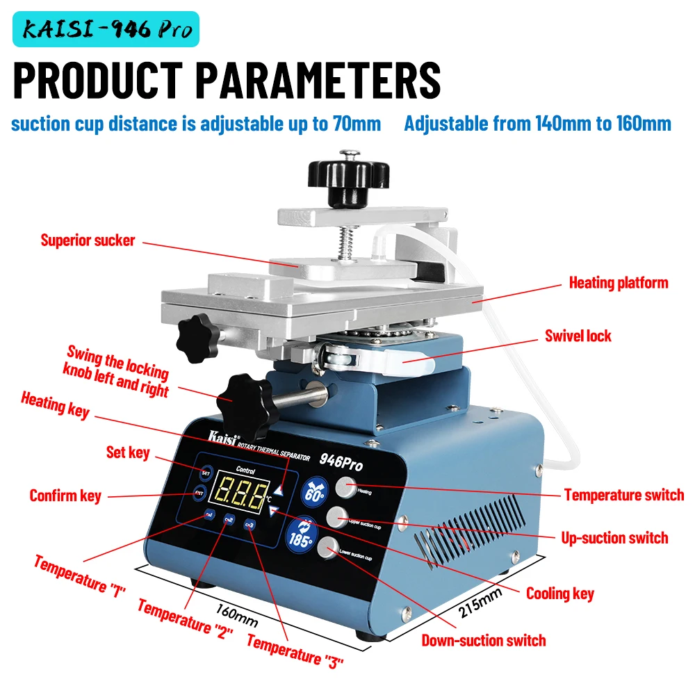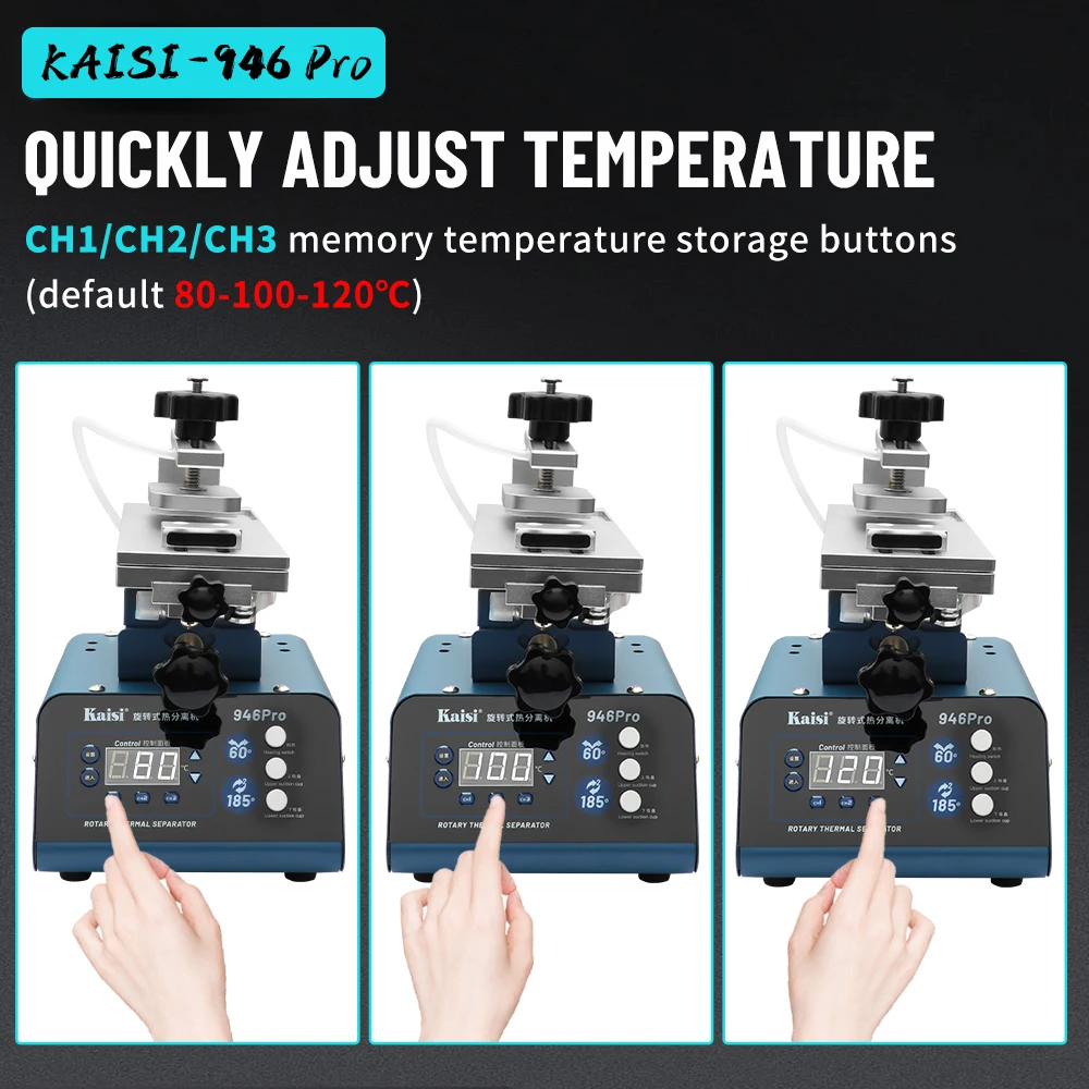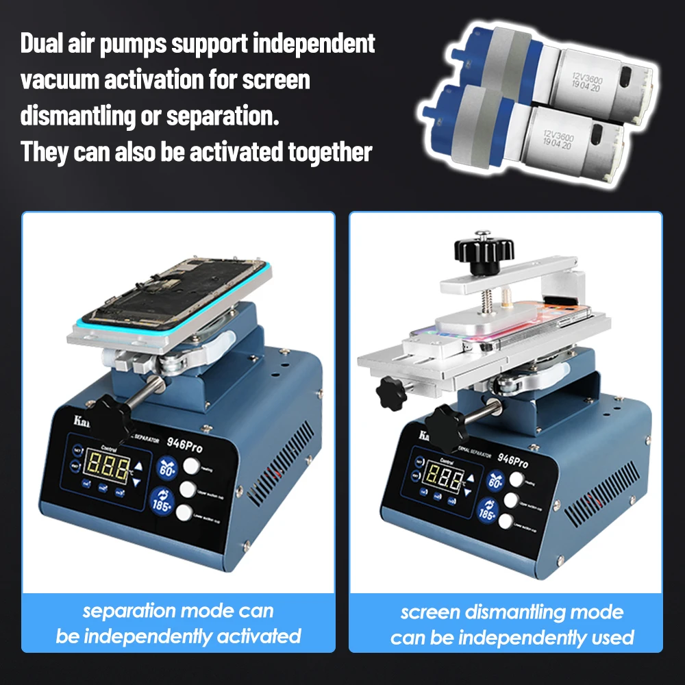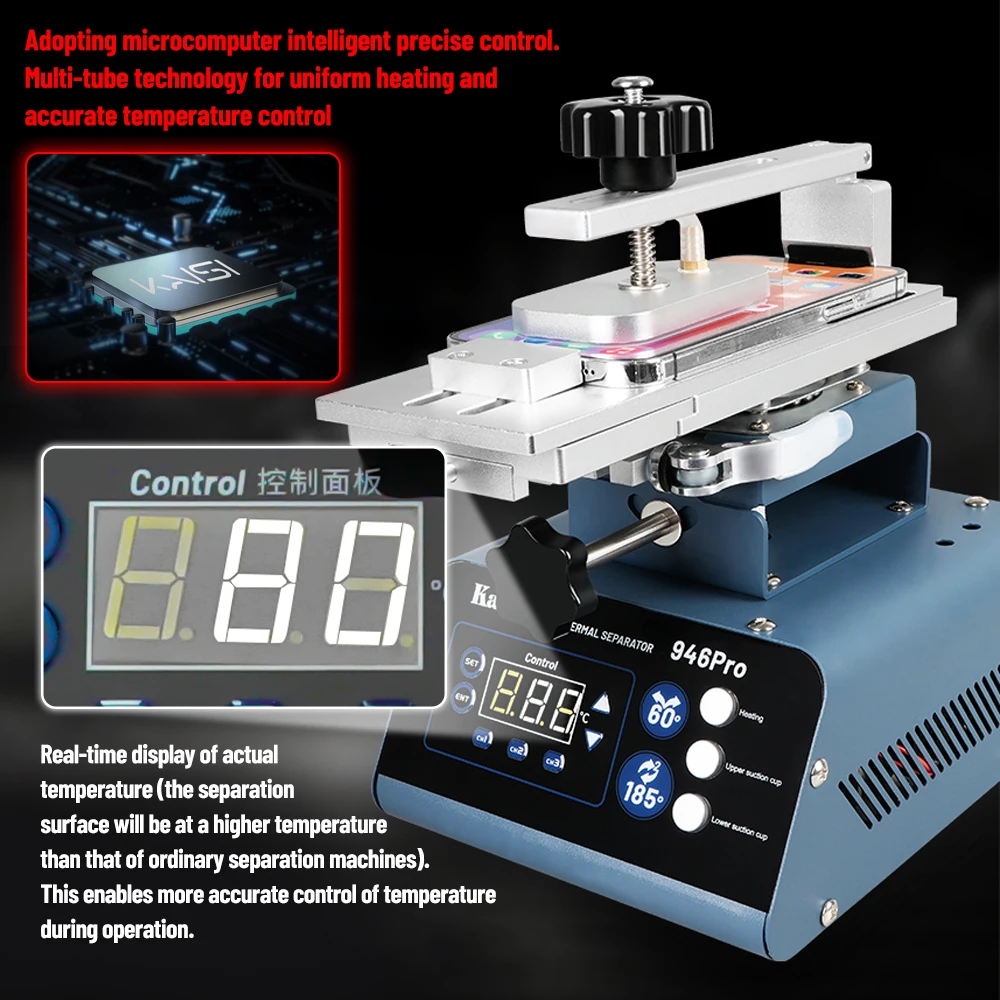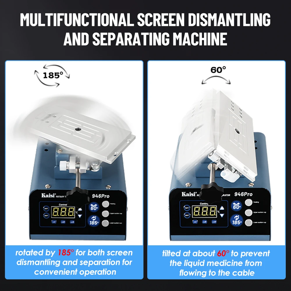 Kaisi 946Pro Multifunctional LCD Screen Separator Double Pump Rotary Tilting Screen Separator Heat-Free Curved Phone Repair ToolAdvice to buyers:When you receive the product, it is recommended that you take a video of the unboxing to avoid damage to the machine and accessories you received. If there is a problem, please communicate with us as soon as possible to avoid unnecessary disputes.Product ParametersProduct Type: Power Tool SetBrand: KAISIModel: 946 ProDesign: Dual Air Pump AdsorptionFunctionality: Heat-Free DisassemblyHeating Temperature:60-200℃Adjustability: 185°Rotation, 60°Tilt AngleCompatibility: Universal Mobile Phone LCD ScreenHost size: 230 x 160 x 175mmSET-1:946pro machine and accessories*1User Manual*1Power cord*10.035x100m cutting wire*1Ultra-thin disassembly blade*1Manual separator*2KS-107 angled electronic scissors*1KS-11 anti-static tweezers*1KS-15 anti-static tweezers*1Neutral fiber cloth pack*1Suitable for screen heating and disassembly, straight screen / curved screen / frame separation. The panel has a camera protection design with a soft silicone fixing clamp.Two independent vacuum pumps with unique lip shaped sealing rings and strong adsorption filter screens60°can be tilted left and right for convenient use of the medicine, avoiding damage to the wiring. The heating platform can rotate back and forth 185°, and the ball bearing rotation structure makes the rotation smoother, meeting different screen separation needs.3 sets of preset memory temperature, single press to read, double press to confirm.Microcomputer control system with real-time display of actual temperature.Integrated heating module with a temperature range of 60-200°C,providing fast heating.Precautions:1.This machine operates at a true temperature,which is generally higher than that of other separators under normal conditions.2.When using the downward vacuum adsorption,the set temperature and the current temperature must not exceed 125°C,otherwise the machine will not start.3.When using the machine,do not direct cold air or a fan at the machine,as this will result in inaccurate temperature readings.