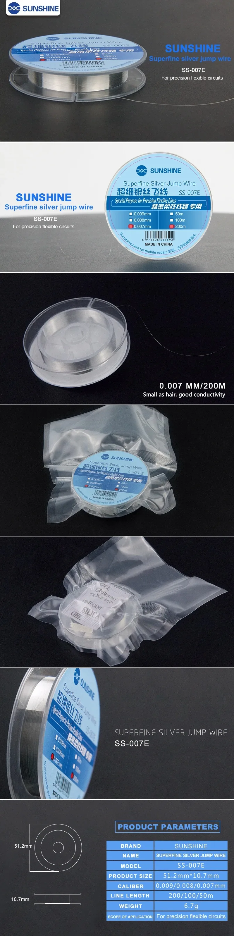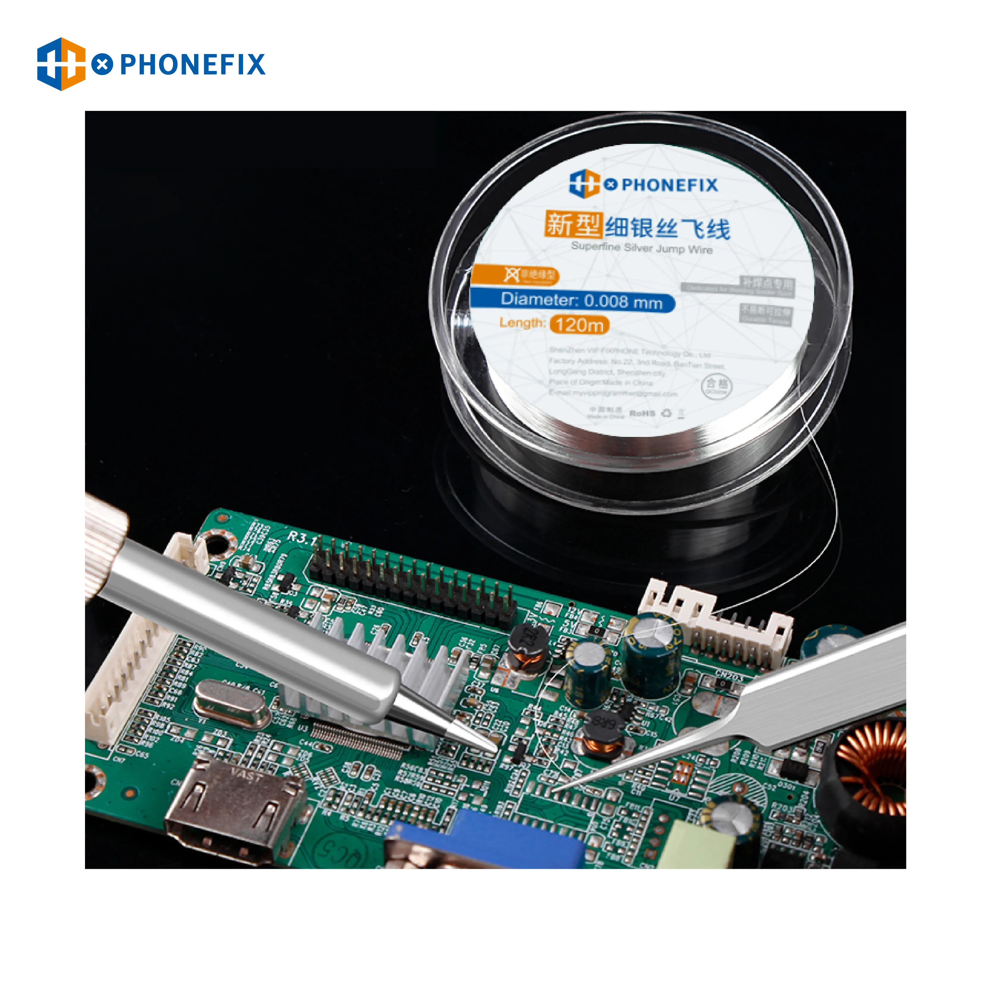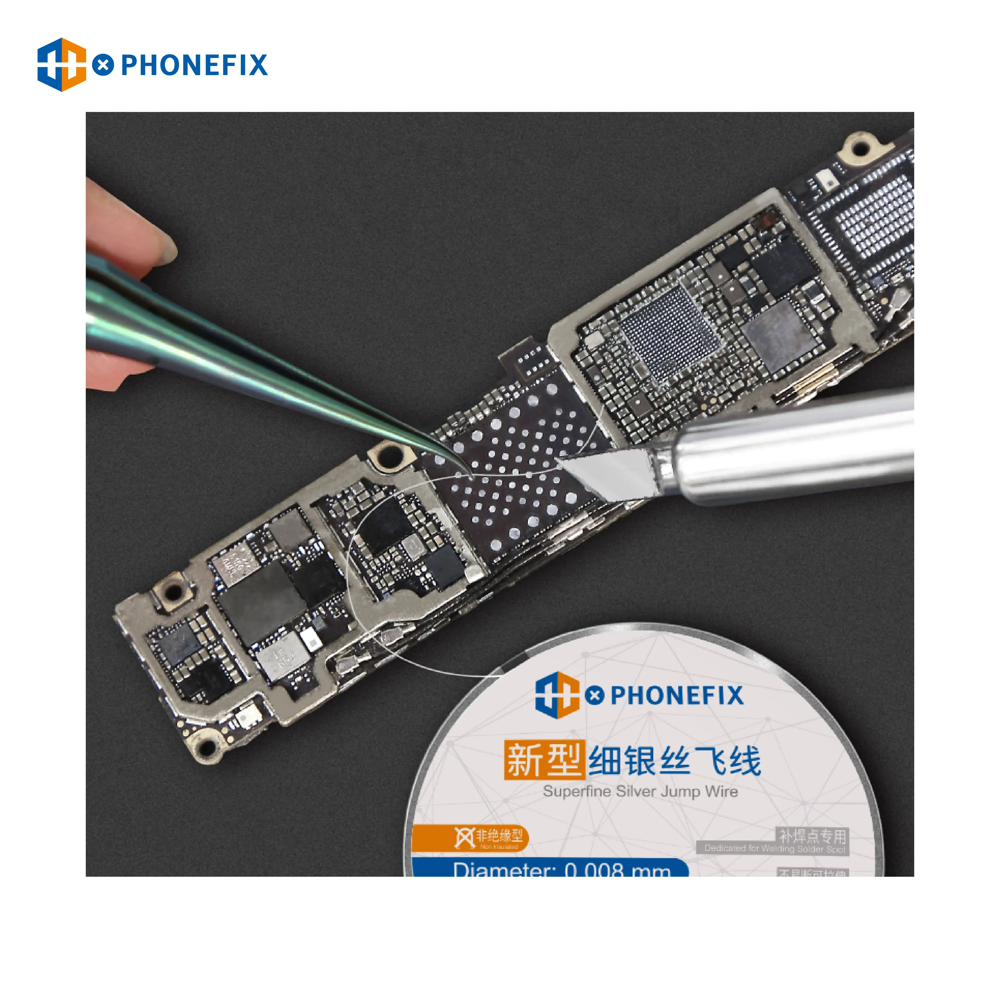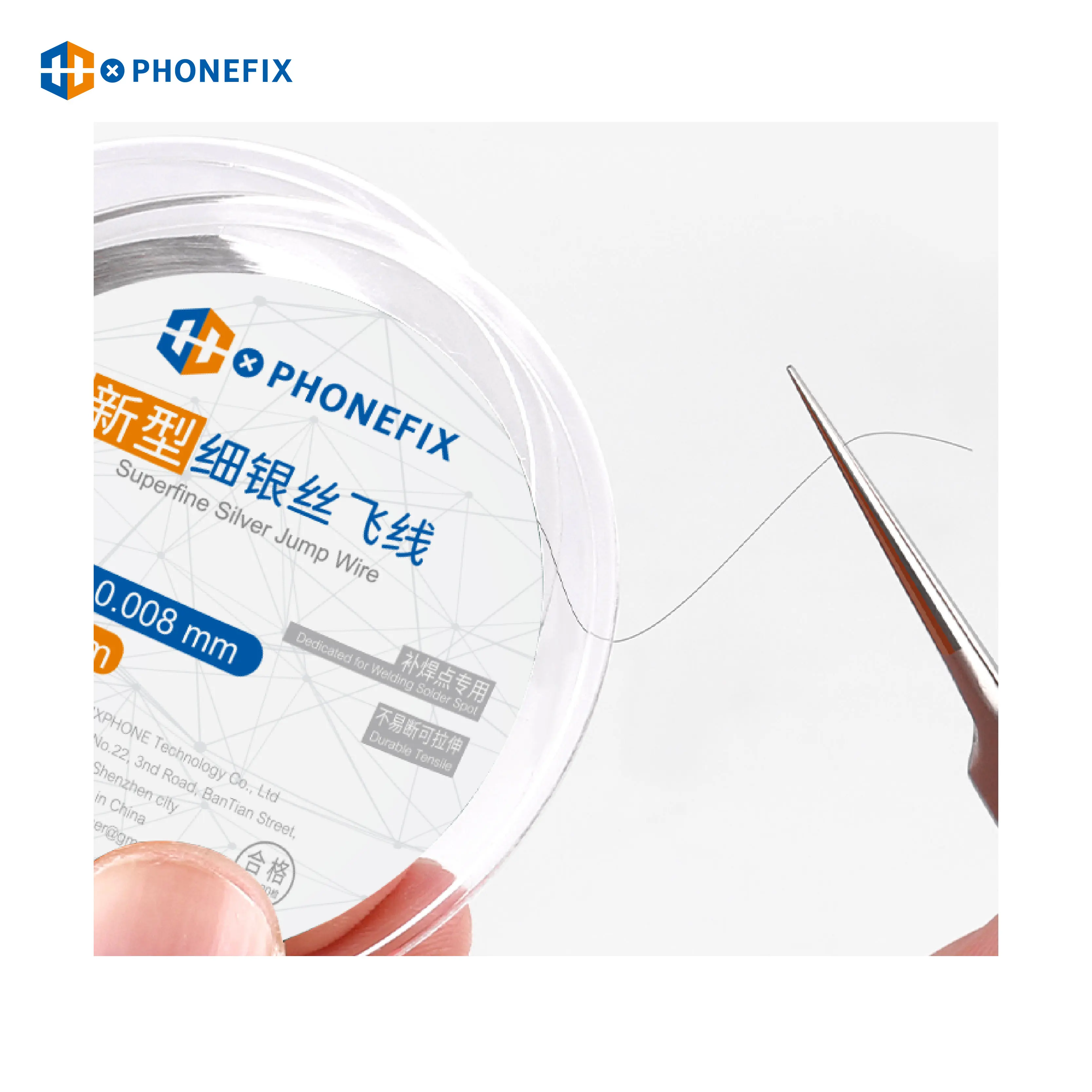 PHONEFIX Flying Line 0.008mm Ultra-fine Silver Wire Fly Line For Phone CPU Fingerprint Touch PCB Welding Repair Tool. 0.008mm 120m ultra fine fly line for phone motherboard repair tool, 120m superfine silver jump wire for phone fingerprint PCB CPU IC repair.SUNSHINE 0.009mm/ 0.007mm Superfine Silver Jump Wire Ultra-fine Silver Wire Fly Line Precision Flexible Circuit Dedicated SS-007E Phone RepairProduct Specification :Item Name: Superfine Silver Jump WireDiameter: 0.008mmLength: 120mColor : SilverDurable and tensile iPhone motherboard fingerprint repair jumper wireOptions:SS-007E Width 0.007mm X Length 200MSS-007E Width 0.009mm X Length 200MPHONEFIX Width 0.008mmxLength 120MPackage includes :1pcs x Superfine Silver Jump Wire