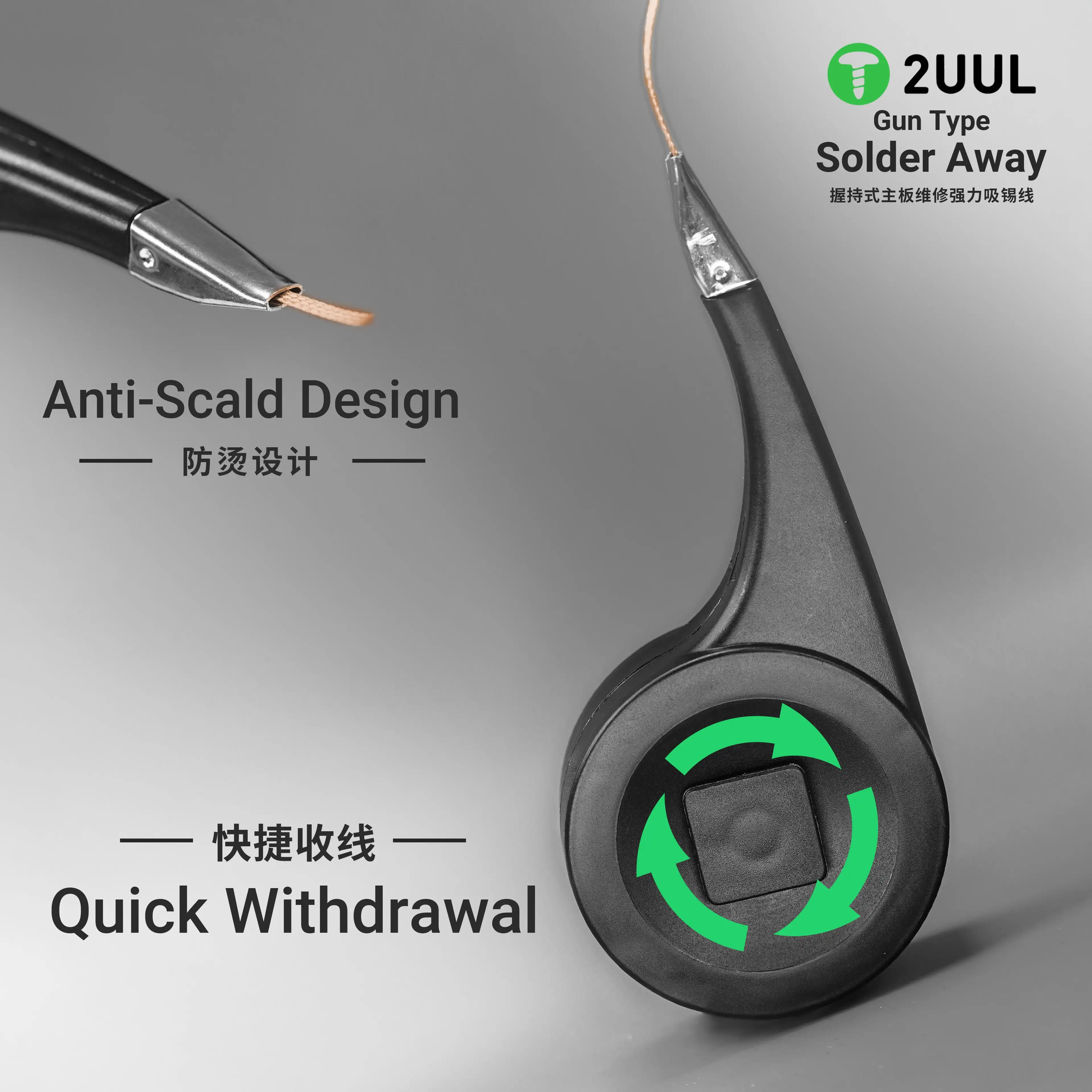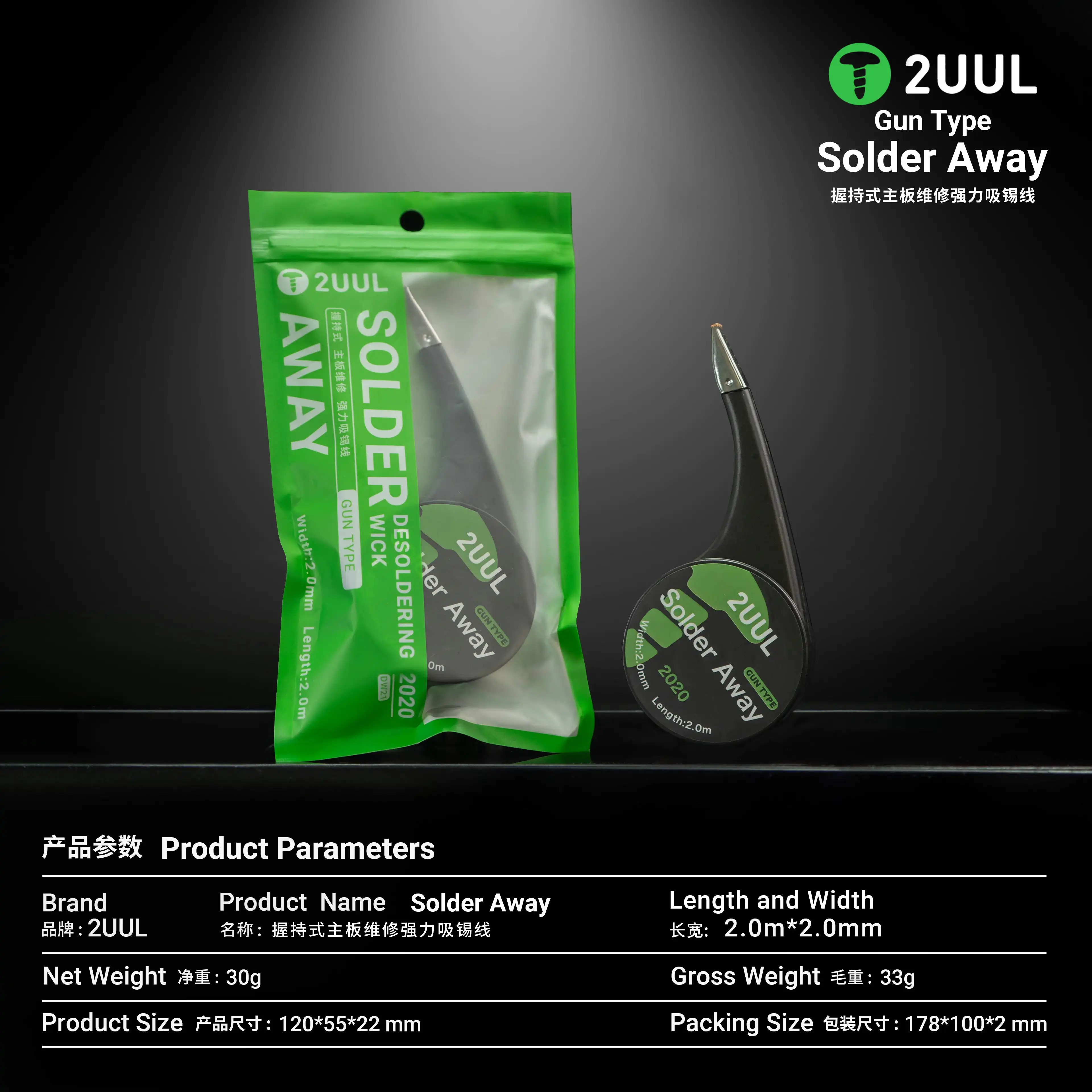 2UUL DW21 Anti-heat Desoldering Wick Wire Mesh Accurate Control Sucker Braid Pure Copper 2mm for Soldering Solder Tin RemoverFeature2.0mm desoldering Wick with anti-hot thumb wheel dispenser.Desoldering wire, twisted wire turntable, grip housing, easy to use.Halogen-free, low residue, self-cleaning, anti-oxidation, suitable for precision phone PCB BGA circuit board desoldering repair.Efficiently absorb excess tin slag during tin removal and clean solder holes, low residue.Wire twister for easy storage and recycling of unused braided copper wire.Anti-scalding heat dissipation nozzle, made of stainless steel, heat-insulating and anti-scalding, not easy to burn hands.