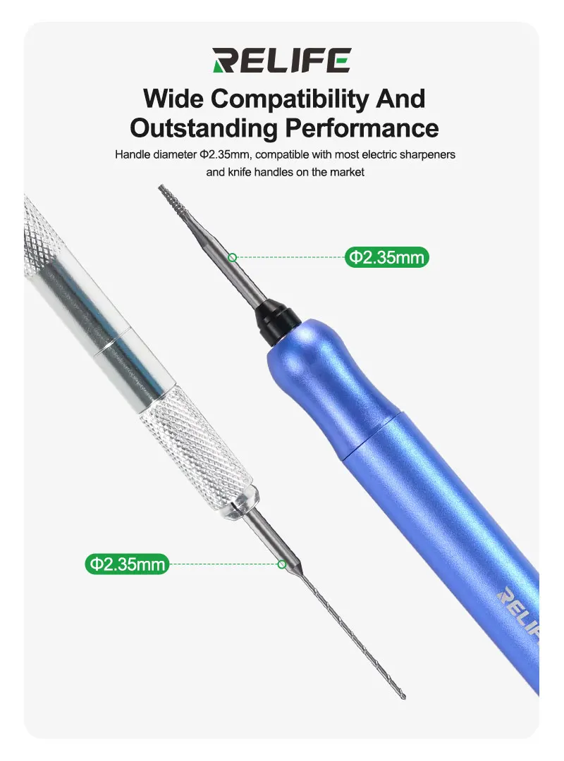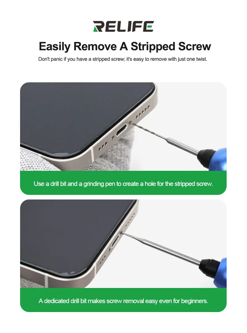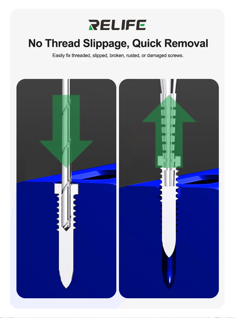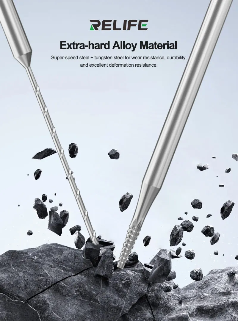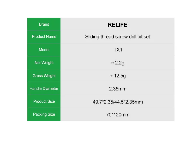 RELIFE TX1 Sliding Thread Screw Drill Bit Set Extra-hard Alloy Material Quickly Remove The Slipped Screws Phone Repair ToolRELIFE TX1 Sliding thread screw drill bit set.Suitable for fixing screws with threaded, slipping, broken, rusted, or damaged parts.Handle diameter Φ2.35mm, compatible with most electric sharpeners and knife handles on the market.Extra-hard alloy material.Super-speed steel + tungsten steel for wear resistance, durability, and excellent deformation resistance.