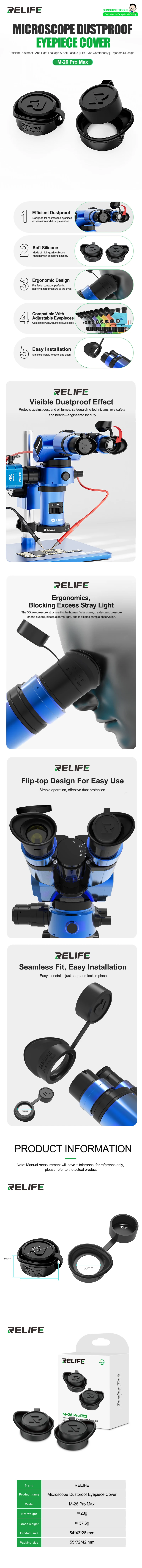 RELIFE Microscope Dustproof Eyepiece Cover – M-26 Pro MaxDedicated to Exceptional QualityExperience superior protection and comfort with the RELIFE M-26 Pro Max Microscope Dustproof Eyepiece Cover. Designed for technicians and professionals, this eyepiece cover ensures efficient dustproofing, anti-light leakage, and anti-fatigue features, all while providing an ergonomic fit for extended use.Key FeaturesEfficient DustproofSpecially designed for microscope eyepiece observation, effectively preventing dust and oil fumes to safeguard eye safety and health.Soft Silicone MaterialMade of high-quality silicone with excellent elasticity for a comfortable and secure fit.Ergonomic Design3D low-pressure structure conforms to facial contours, applying zero pressure to the eyes and blocking excess stray light for clearer sample observation.Compatible With Adjustable EyepiecesFits a wide range of microscope eyepieces for versatile use.Easy InstallationSimple snap-and-lock design allows for quick installation, removal, and cleaning.Flip-Top DesignConvenient flip-top feature ensures easy access while maintaining effective dust protection.Seamless FitPrecisely engineered for a snug fit on 30mm eyepieces, enhancing usability and performance.Product Specifications| Brand | RELIFE || Product Name | Microscope Dustproof Eyepiece Cover || Model | M-26 Pro Max || Net Weight | ≈28g || Gross Weight | ≈37.6g || Product Size | 54*43*28 mm || Packing Size | 55*72*42 mm |Note: Manual measurements may have slight tolerances. Specifications are for reference only; actual product may vary slightly.Why Choose RELIFE?Visible Dustproof Effect: Protects against environmental contaminants, ensuring long-term eye safety.Engineered for Duty: Durable and reliable for professional use.User-Friendly Design: Combines functionality with comfort for uninterrupted workflow.Upgrade your microscope experience with the RELIFE M-26 Pro Max Eyepiece Cover – where innovation meets ergonomic excellence!
