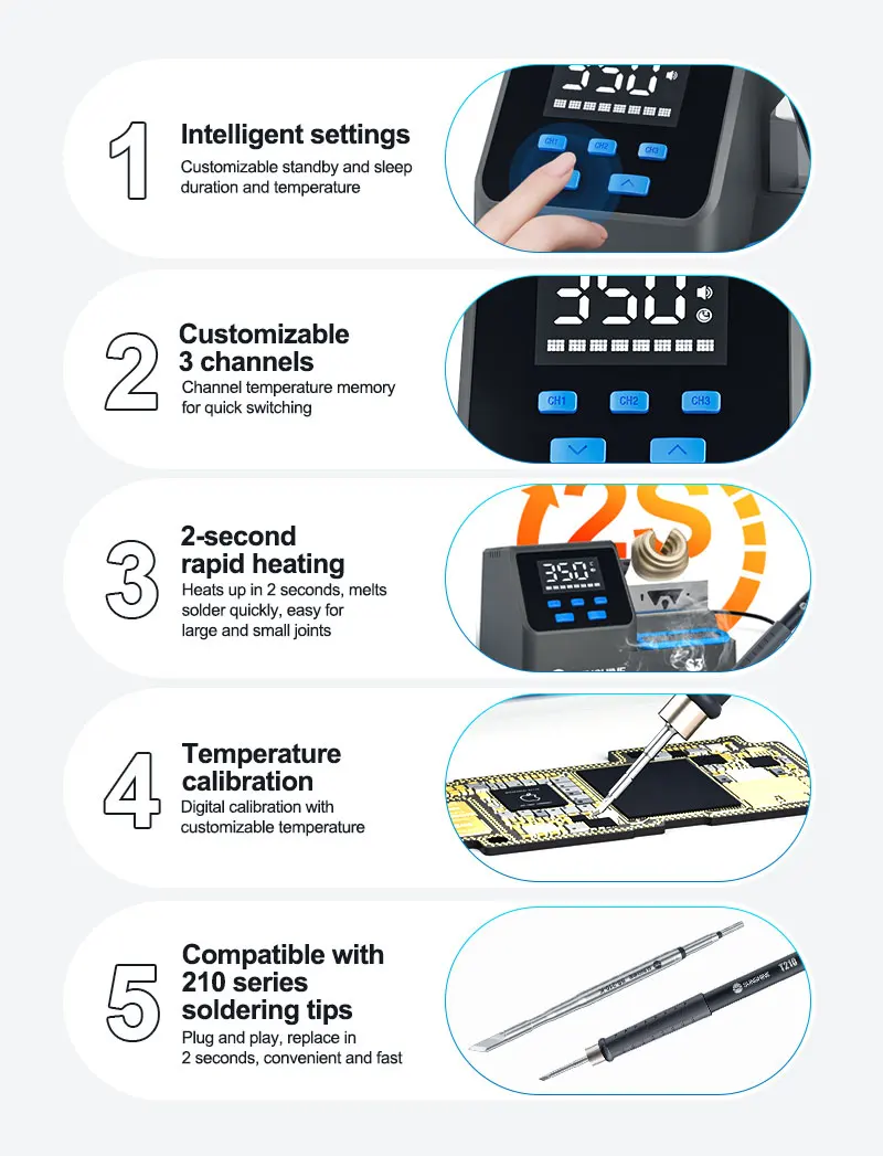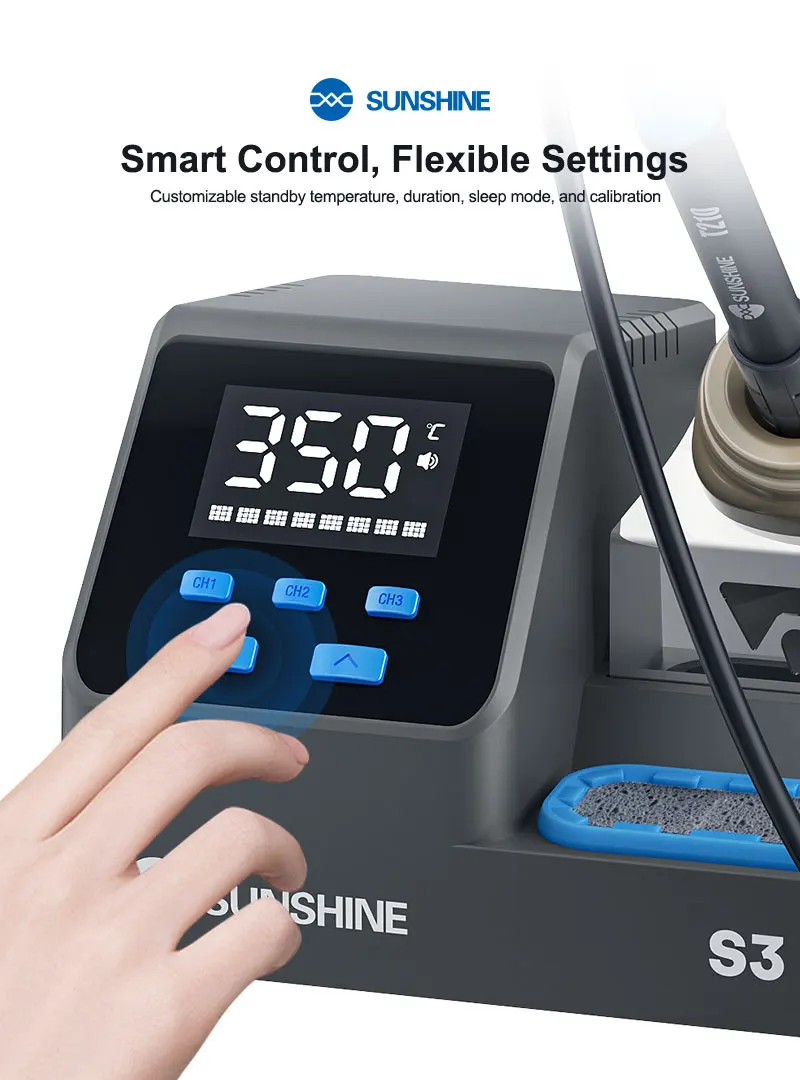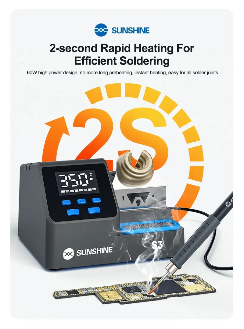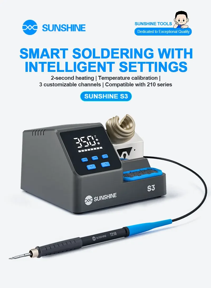 SUNSHINE S3 210 Intelligent Soldering Station Universal C210 Handle Quick Heating Soldering Iron Smart Sleep Welding PlatformSUNSHINE S3 210 intelligent soldering station:.Heats up in 2 seconds, melts solder quickly, easy for large and small joints .Customizable standby temperature, duration, sleep mode, and calibration .LED display for real-time monitoring, 100–480°C precise control, 3 quick-access modes .Smart auto sleep,Low-power sleep mode for energy saving and durability .Tip holder design allows multiple solder tips, neat and organized .Easy to remove, made of heat-resistant silicone, large capacity for solder waste .Universal 210 series handle,Plug and play, 2-second replacement, fast heat transfer, anti-oxidation, easy tinning