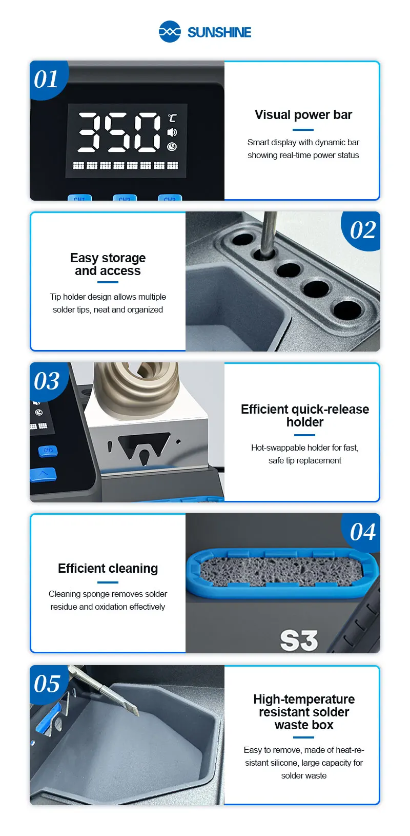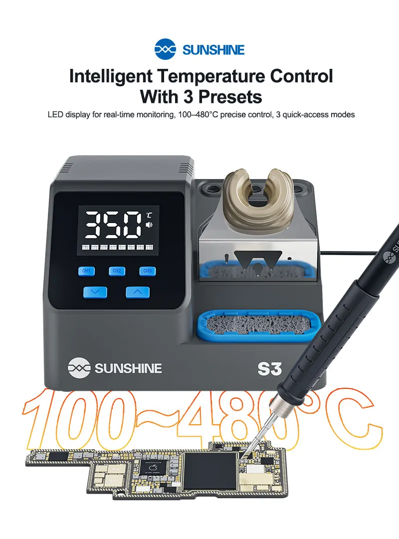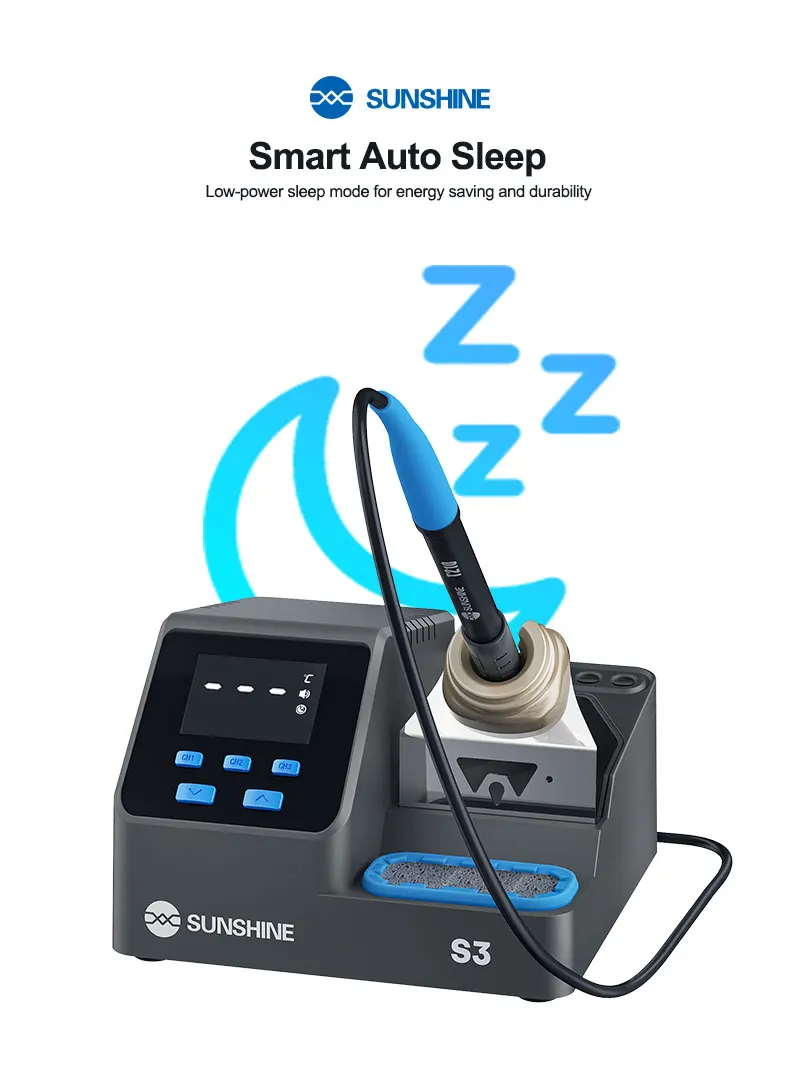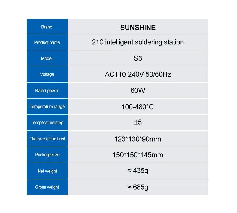 SUNSHINE S3 210 Intelligent Soldering Station Universal C210 Handle Quick Heating Soldering Iron Smart Sleep Welding PlatformSUNSHINE S3 210 intelligent soldering station:.Heats up in 2 seconds, melts solder quickly, easy for large and small joints .Customizable standby temperature, duration, sleep mode, and calibration .LED display for real-time monitoring, 100–480°C precise control, 3 quick-access modes .Smart auto sleep,Low-power sleep mode for energy saving and durability .Tip holder design allows multiple solder tips, neat and organized .Easy to remove, made of heat-resistant silicone, large capacity for solder waste .Universal 210 series handle,Plug and play, 2-second replacement, fast heat transfer, anti-oxidation, easy tinning