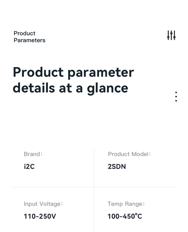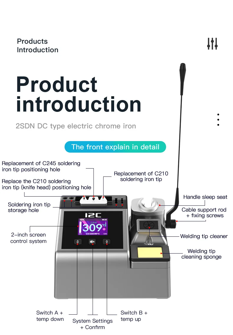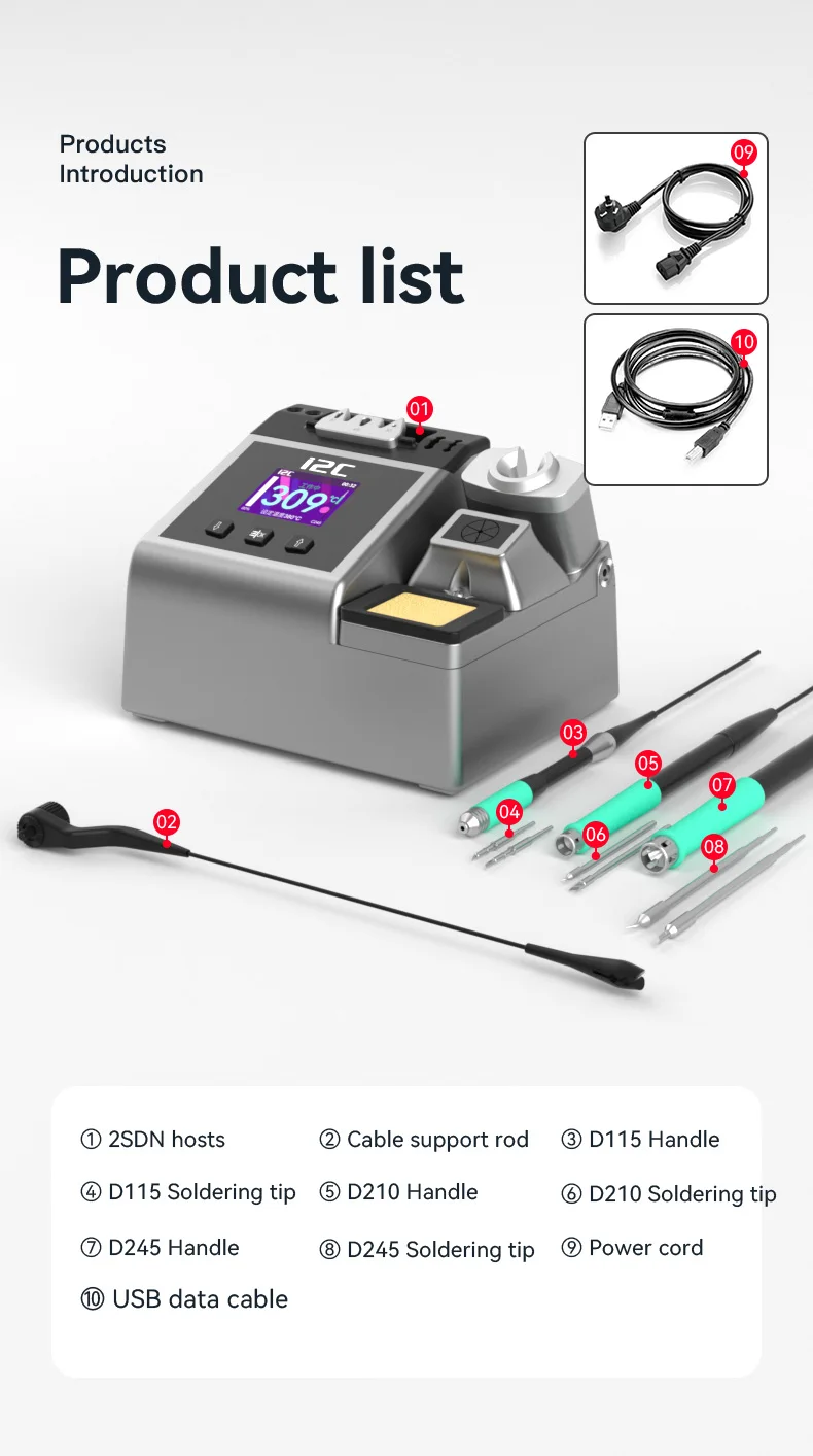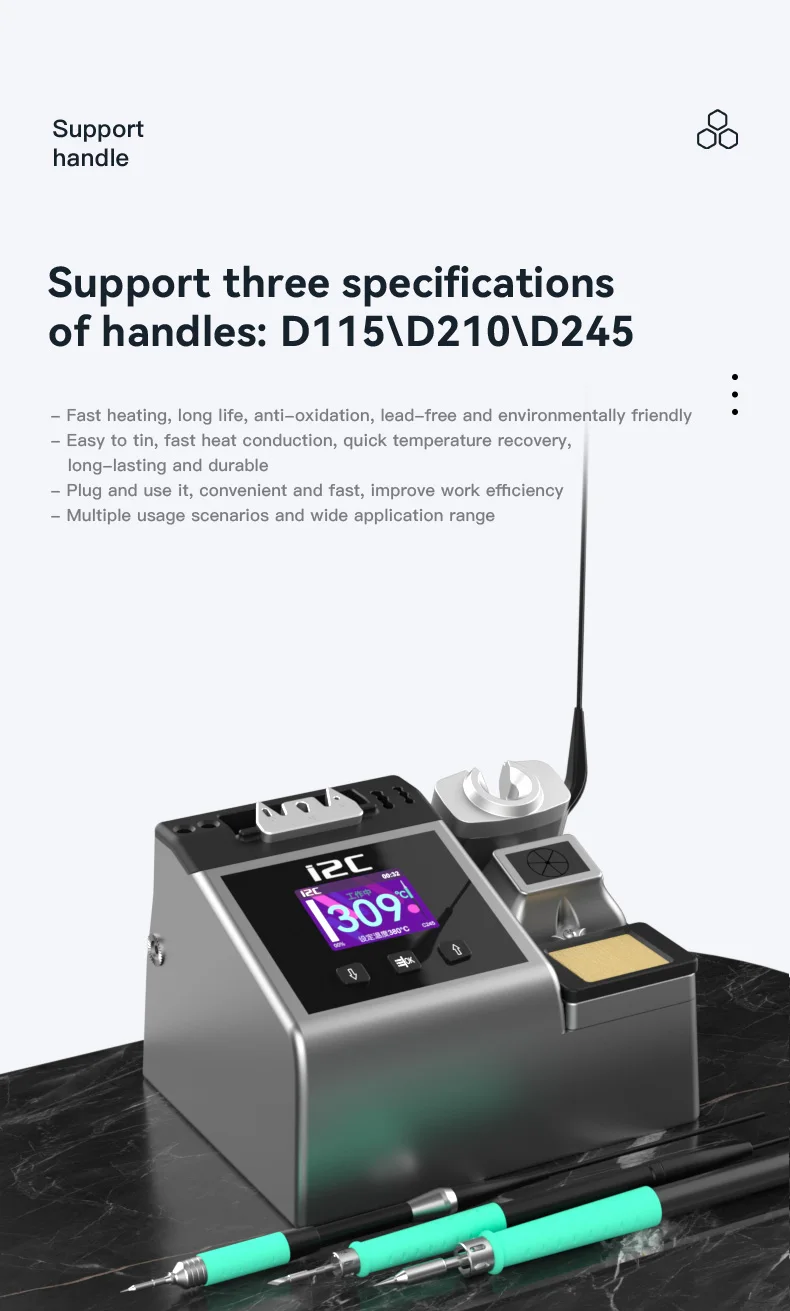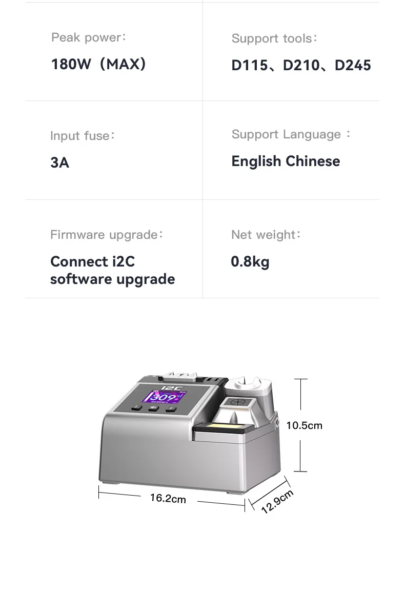 I2C 2SDN Temperature Control Welding Station Special Designed D210/115/245 Solder Iron Tips Precision Nano Soldering PCB RepairPlease note: i2C 2SDN soldering station only support original i2C D115/D210/D245 Soldering handle and tips , it is not compatible with other brands of soldering iron tips and handle.Parameters: Item :i2C 2SDN Nano soldering stationPower: 180W(MAX)Input Voltage: Universal AC 110-250VFrequency: 50-60HzInput fuse: 3ATemperature Range: 100°C-450°C/212°F-842°FProduct Description: 16.2*12.9*10.5cmNote: I2C 2SDN is suitable for i2C D210/D115/D245 handle and tipsSpecial attention:Important note for handle selection: I2C 2SDN is developed based on precise temperature control technology and is the latest generation of soldering stations. The development focuses on: small temperature error (very small error can be achieved through calibration) fast heating, fast temperature recovery, do not use 936 series or DIY Compared with other products, there is no comparability. Because the 936 series products are only temperature-adjusting soldering stations, the temperature difference is very large. If you choose 350 degrees, the actual temperature may be as high as 450 degrees. The diy series is responsible for meeting some people who like high temperature requirements. Beginners, deliberately turn up the temperature. Maintenance work is not a child’s play and cannot be done by feel. Temperature judgment and calibration should be based on a temperature tester.So how to choose the soldering station configuration according to your actual work scope? 1. For processing ultra-fine circuits under the microscope, such as repairing multi-layer circuit boards, complex flying leads, etc., D115 heating core and handle can be selected, the cutter head handles small solder joints, and the pointed tip handles tiny solder joints. 2. Repair mobile phones, car remote controls, precision small electrical appliances, cables, etc., choose D210 heating core and handle, use cutter heads for small and medium solder joints such as IC bases, and sharp tips for small flying wires and small solder joints. 3. For home appliance maintenance, mobile phone maintenance, computer motherboards, choose high-power C245 heating cores and handles, large solder joints with a knife head, small solder joints with a pointed tip, the advantage of D245 is to take into account the size of the solder joints, high power (150W ), but due to the relatively large size of the soldering iron tip, it is not easy to handle tiny solder joints. To sum up the above: choose C115 for professional use in tiny solder joints, C210 for professional use in tiny and small solder joints, and C245 for both large and small solder joints.