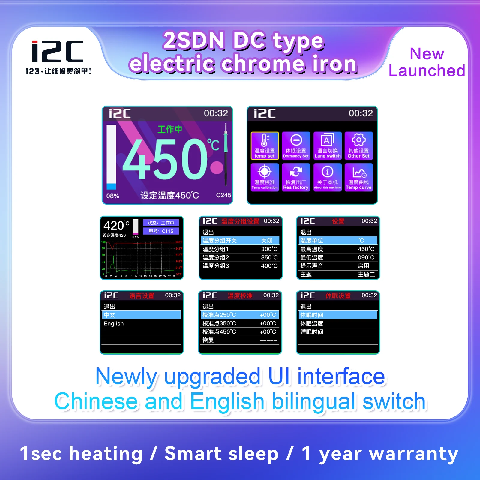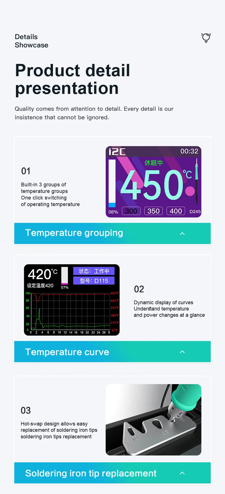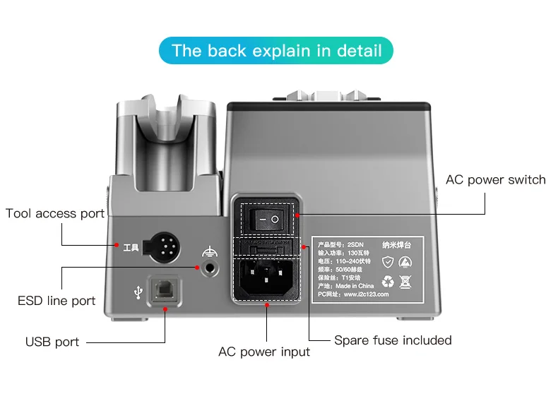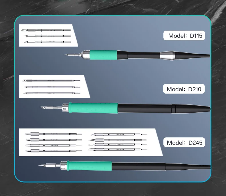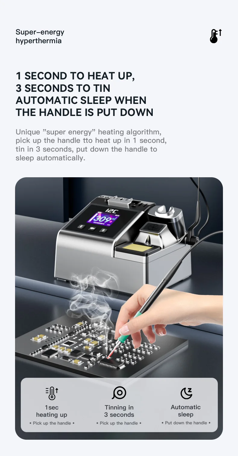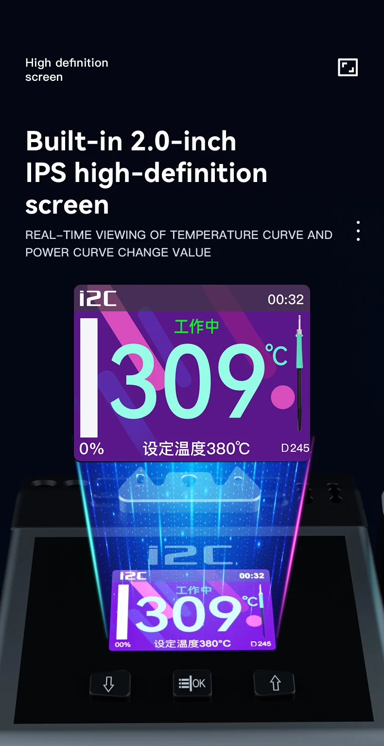 I2C 2SDN Temperature Control Welding Station Special Designed D210/115/245 Solder Iron Tips Precision Nano Soldering PCB RepairPlease note: i2C 2SDN soldering station only support original i2C D115/D210/D245 Soldering handle and tips , it is not compatible with other brands of soldering iron tips and handle.Parameters: Item :i2C 2SDN Nano soldering stationPower: 180W(MAX)Input Voltage: Universal AC 110-250VFrequency: 50-60HzInput fuse: 3ATemperature Range: 100°C-450°C/212°F-842°FProduct Description: 16.2*12.9*10.5cmNote: I2C 2SDN is suitable for i2C D210/D115/D245 handle and tipsSpecial attention:Important note for handle selection: I2C 2SDN is developed based on precise temperature control technology and is the latest generation of soldering stations. The development focuses on: small temperature error (very small error can be achieved through calibration) fast heating, fast temperature recovery, do not use 936 series or DIY Compared with other products, there is no comparability. Because the 936 series products are only temperature-adjusting soldering stations, the temperature difference is very large. If you choose 350 degrees, the actual temperature may be as high as 450 degrees. The diy series is responsible for meeting some people who like high temperature requirements. Beginners, deliberately turn up the temperature. Maintenance work is not a child’s play and cannot be done by feel. Temperature judgment and calibration should be based on a temperature tester.So how to choose the soldering station configuration according to your actual work scope? 1. For processing ultra-fine circuits under the microscope, such as repairing multi-layer circuit boards, complex flying leads, etc., D115 heating core and handle can be selected, the cutter head handles small solder joints, and the pointed tip handles tiny solder joints. 2. Repair mobile phones, car remote controls, precision small electrical appliances, cables, etc., choose D210 heating core and handle, use cutter heads for small and medium solder joints such as IC bases, and sharp tips for small flying wires and small solder joints. 3. For home appliance maintenance, mobile phone maintenance, computer motherboards, choose high-power C245 heating cores and handles, large solder joints with a knife head, small solder joints with a pointed tip, the advantage of D245 is to take into account the size of the solder joints, high power (150W ), but due to the relatively large size of the soldering iron tip, it is not easy to handle tiny solder joints. To sum up the above: choose C115 for professional use in tiny solder joints, C210 for professional use in tiny and small solder joints, and C245 for both large and small solder joints.