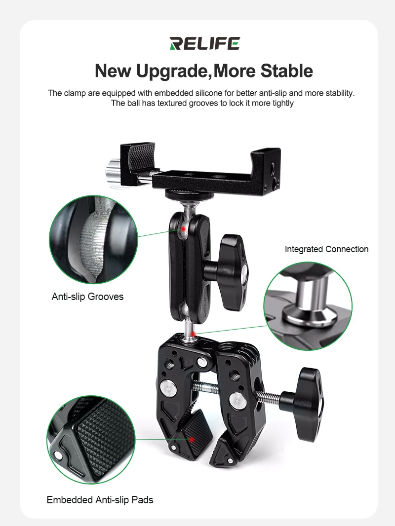 RELIFE TO2 Multi-Directional Clamp Multi-functional Adjustment Aluminum Alloy Material Mobile Phone Repair ClampRELIFE TO2 Multi-Directional Clamp.Suitable for fixing cameras, phones, tablets, and other auxiliary devices. Can be fixed on tripods, bicycles, railings, tables, and various other settings..The clamp are equipped with embedded silicone for better anti-slip and more stability. The ball has textured grooves to lock it more tightly..Dual ball heads enable flexible positioning with wide working range