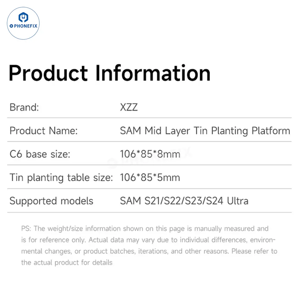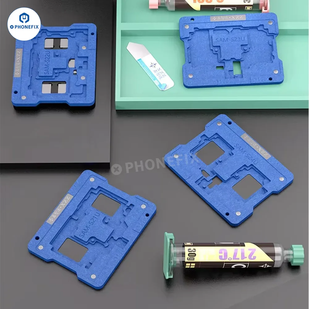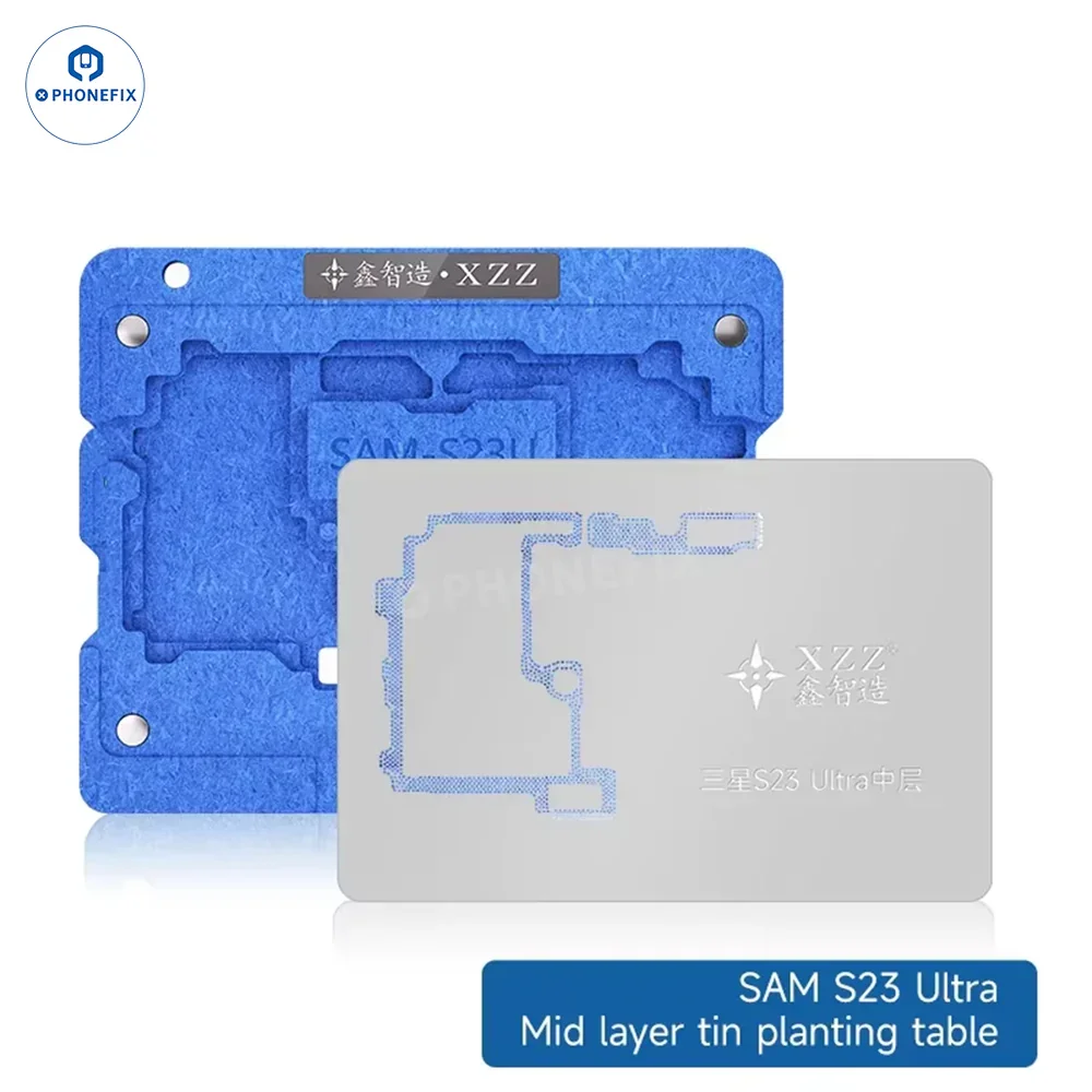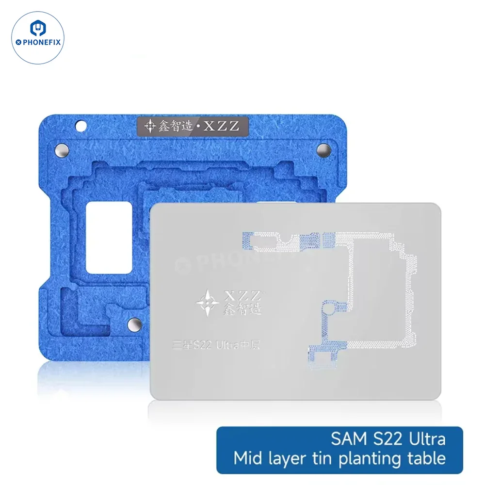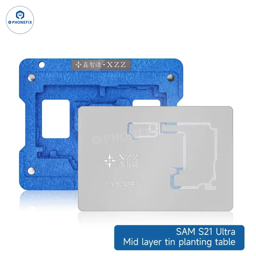 XZZ AR SAM Motherboard Middle Layer Stencil Tin Planting Reballing Platform for S21/S22/S23/S24 Ultra Soldering Repair Tool SetDescriptionXZZ AR Series SAM Motherboard Middle Layer Planting Tin Platform for Samsung S21 Ultra, S22 Ultra, S23 Ultra and S24 Ultra. XINZHIZAO XZZ Samsung motherboard reballing platform with C6 magnetic base, S21U S22U S23U S24U positioning platform and mid layer stencil for Samsung motherboard soldering repair. Features:1. Edge groove design, convenient access to steel mesh. Take the steel mesh from the corners to avoid large areas of mesh detachment at the same time, which may cause the solder paste to be taken away.2. Strong adsorption function, magnetic stability. Built in three large magnets, which can tightly connect the steel mesh with the tin planting table.3. Extended universal base, the model is continuously being updated…. No need to replace the base, one-time purchase, long-term use.4. Precise positioning with tight seams, high precision reduces errors and high precision equipment processing and manufacturing, witherrors close to zero, improves maintenance efficiency, and avoids repeated operations due to insufficient solder paste.5. Made of high-quality steel, crafted with precision, wear-resistant, and high toughness. Selected high-quality steel to create steel mesh, with good rebound performance and long-lasting durability.Option:1. S21 Ultra positioning platform with mid layer stencil.2. S22 Ultra positioning platform with mid layer stencil.3. S23 Ultra positioning platform with mid layer stencil.4. S24 Ultra positioning platform with mid layer stencil.5. C6 Magnetic Base6. Full SetProduct Parameters:Brand: XZZProduct Name: SAM Mid Layer Tin Planting PlatformC6 base size: 106x85x8mmTin planting table size:106x85x5mmSupported models: SAM S21/S22/S23/S24 Ultra
