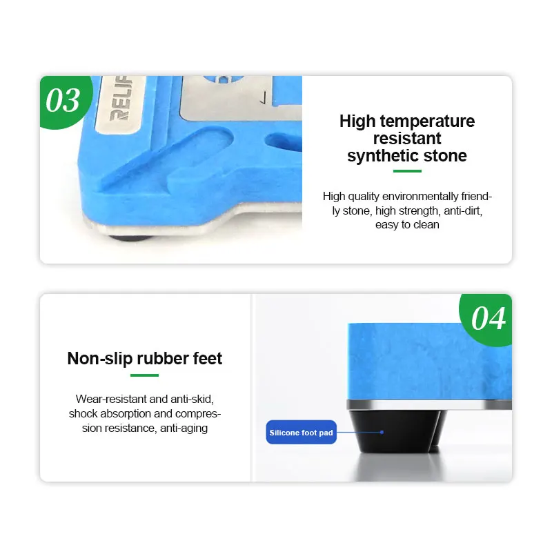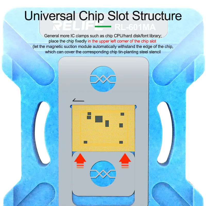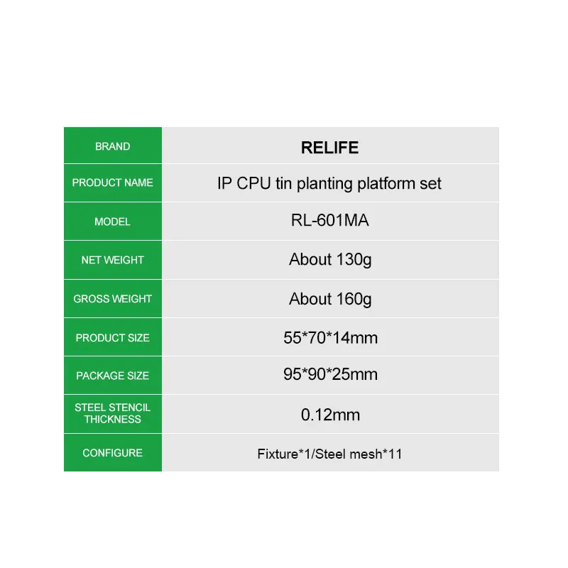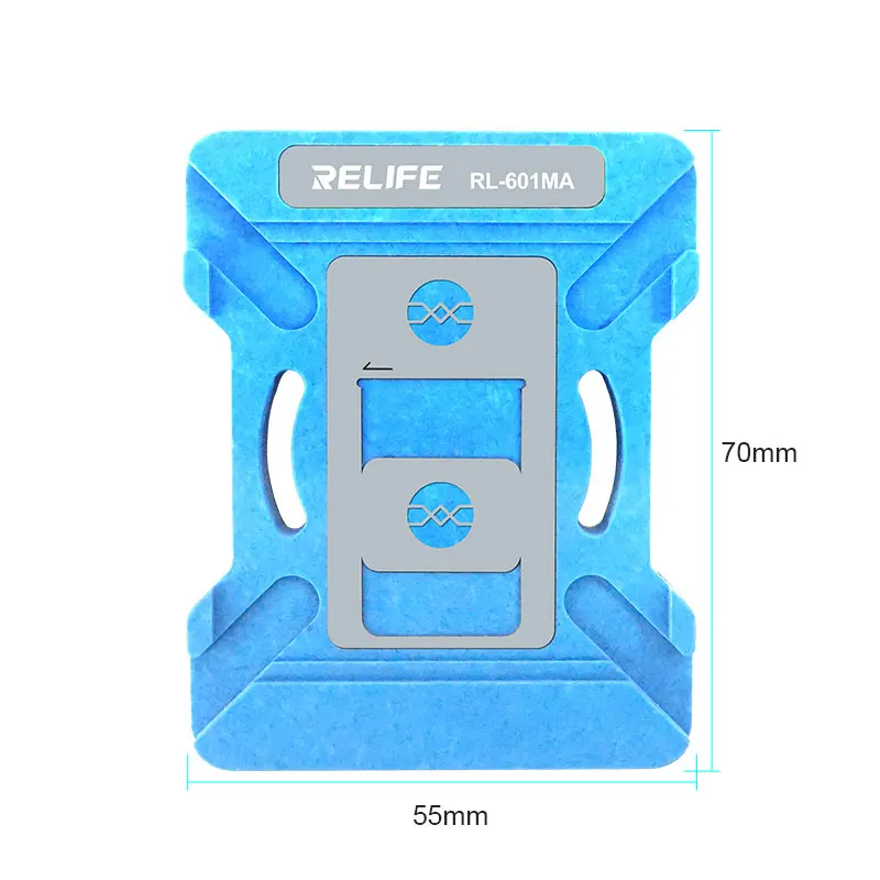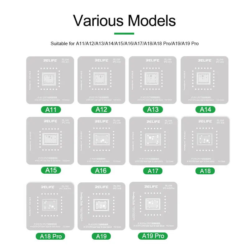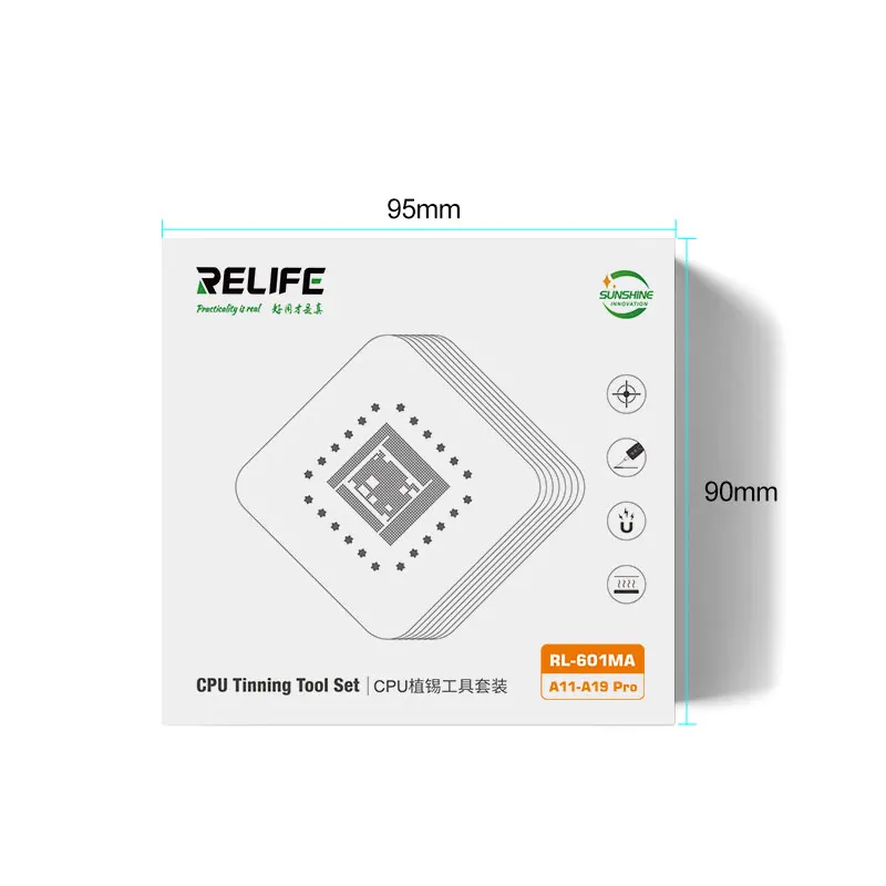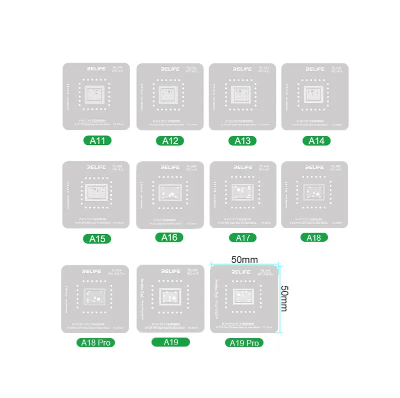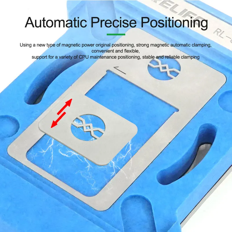 RELIFE RL-601MA A11-A19 Pro CPU Planting Tin Platform Set for Mobile Phone Logic Board BGA Solder Ball Repair Base StencilRELIFE RL-601MA CPU Repair Fixture Set/IP Series (A11-A19 Pro):.Using a new type of magnetic power original positioning, strong magnetic automatic clamping, convenient and flexible, support for a variety of CPU maintenance positioning, stable and reliable clamping .Built-in high temperature magnet, strong magnetic adsorption, precise positioning, no offset, high temperature magnetic unchanged .High-quality steel, round and square precise hole positions make the solder balls more rounded and prevent the mesh from jamming the solder balls