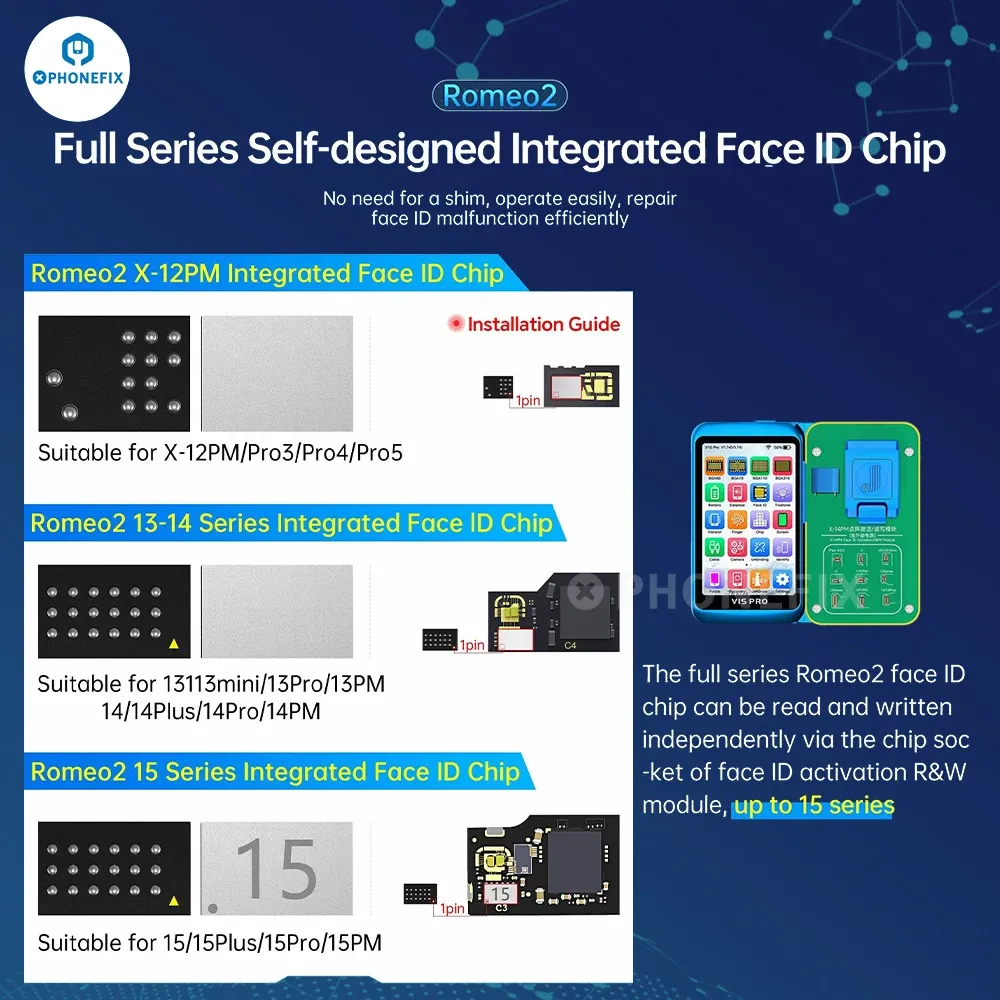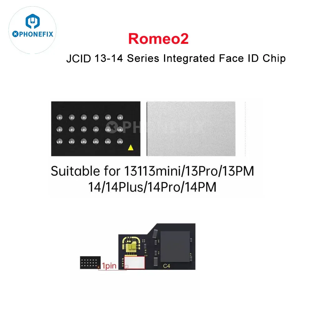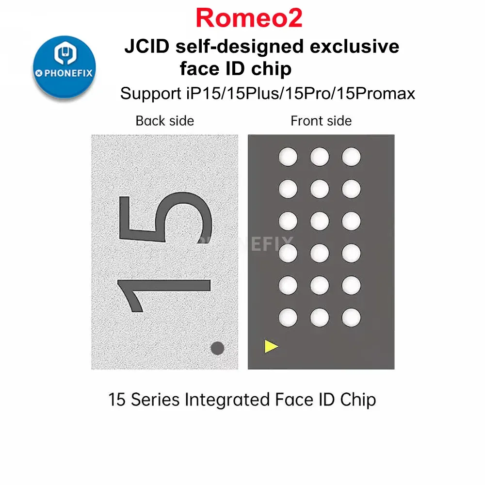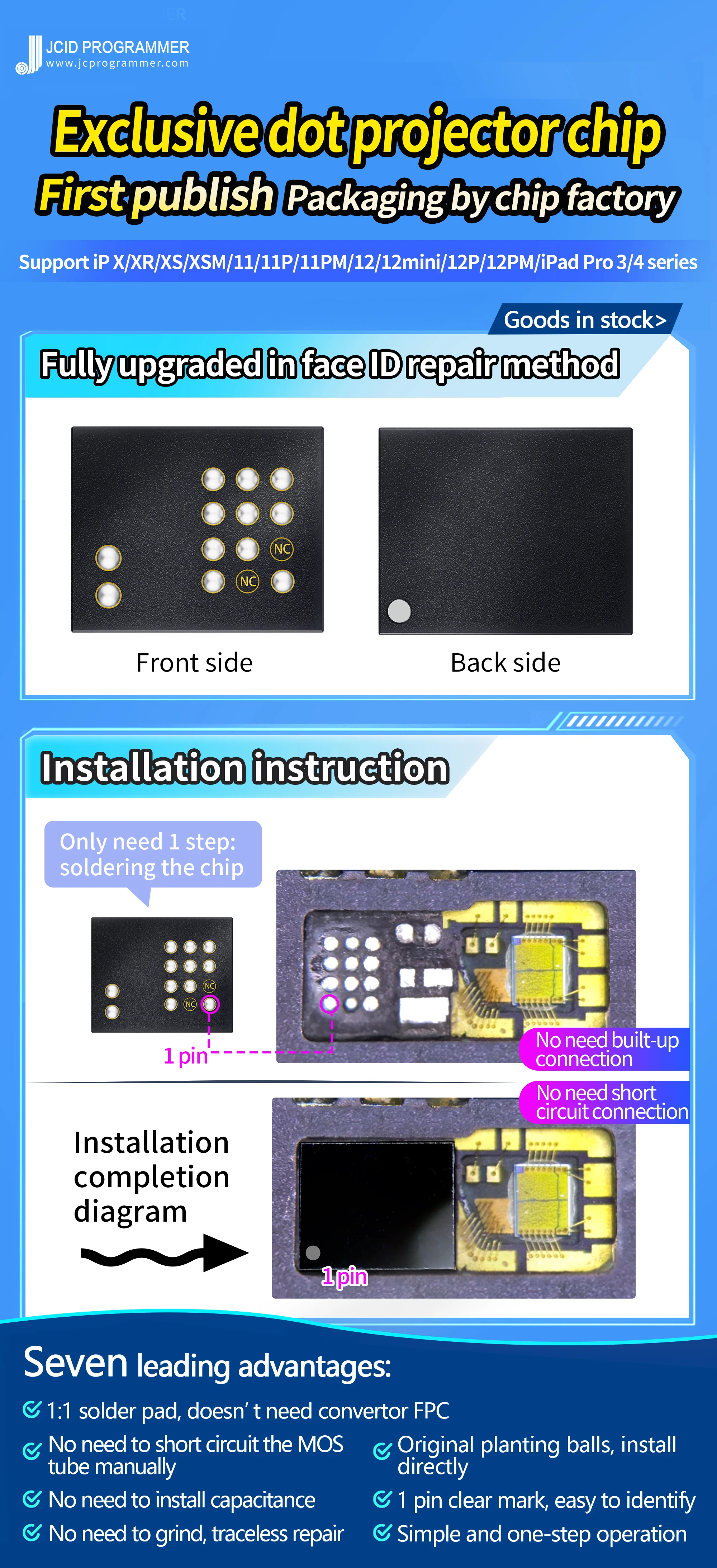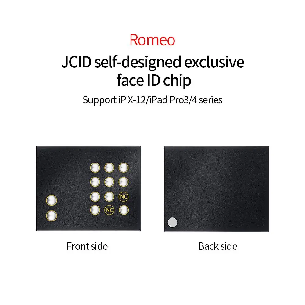 JCID Face integrated chip universal dot projector IC for iPhone X-14 15Pro Max iPad Pro 3/4 Face ID repair. New JCID integrated chip dot matrix IC with pin and tin balls, no need to convert FPC capacitor and MOS tube, simple operation. JC dot matrix lattice chip Face ID repair integrated IC for iPhone X/XS/XS MAX/XR/11/11Pro/11 Pro Max/12/12 mini/12 Pro/12 13/14/15Pro Max, iPad Pro 3/4.