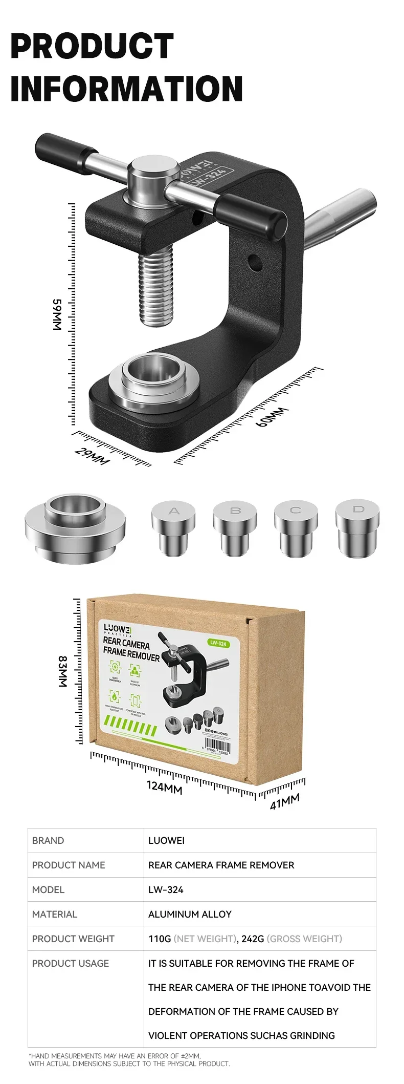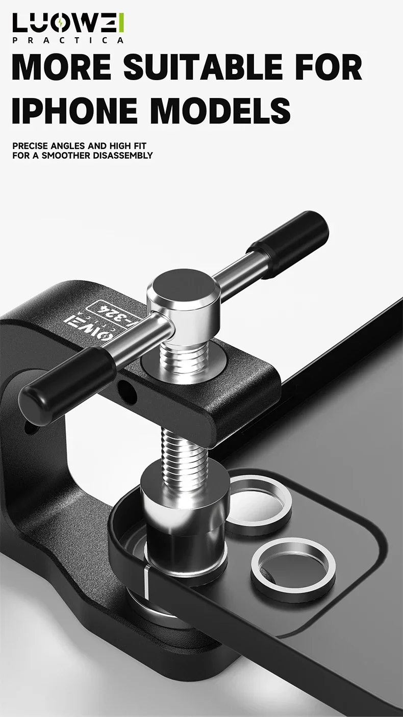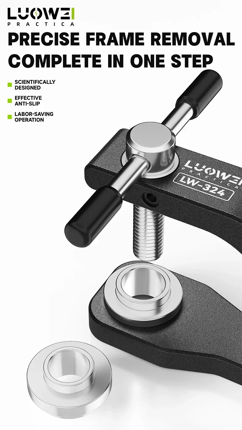 أداة احترافية من LUOWEI مصممة خصيصًا لتسهيل عملية فك إطارات كاميرات الهواتف الخلفية دون انزلاق أو تلف. توفر ثباتًا عاليًا وتقلل الجهد أثناء العمل، مع تصميم مريح ومتين يدعم عدة مقاسات وإطارات مختلفة.