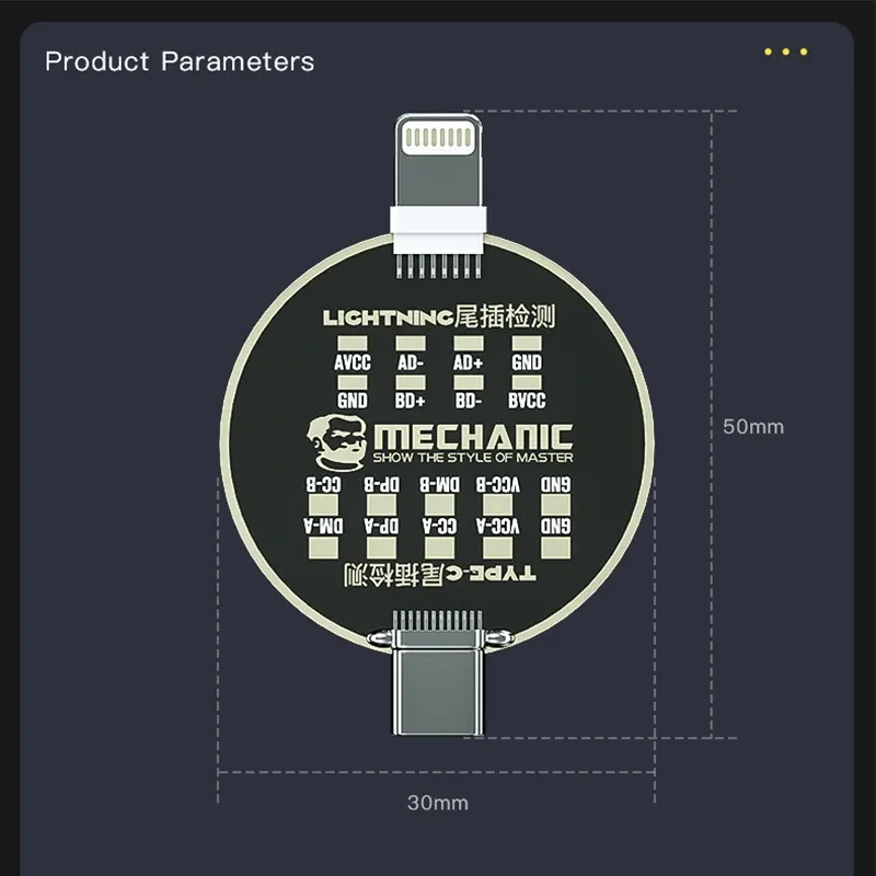 MECHANIC T810 لوحة اختبار مخارج الشحن للهواتف — مناسبة لآيفون وأندرويد (Lightning / Type-C) للكشف عن أعطال عدم الشحن