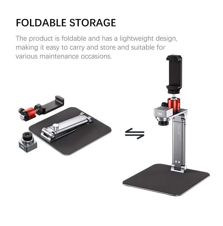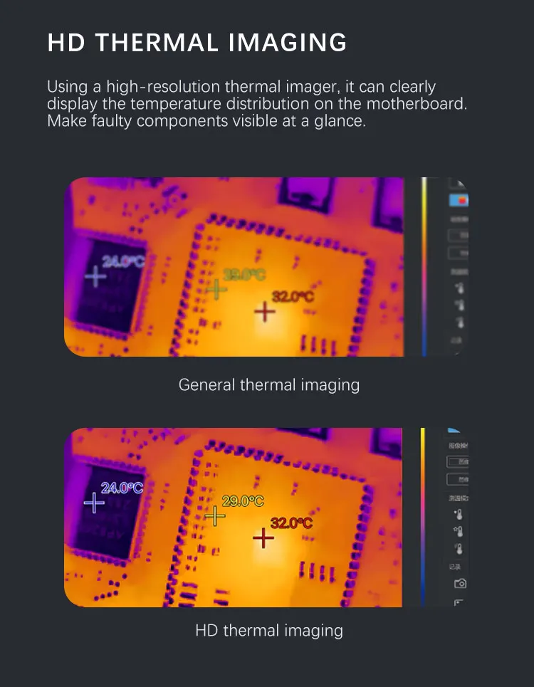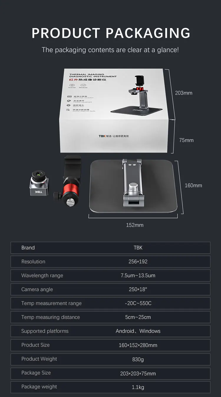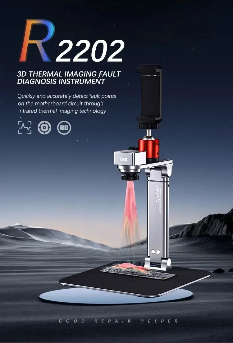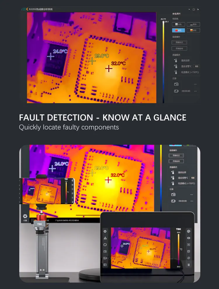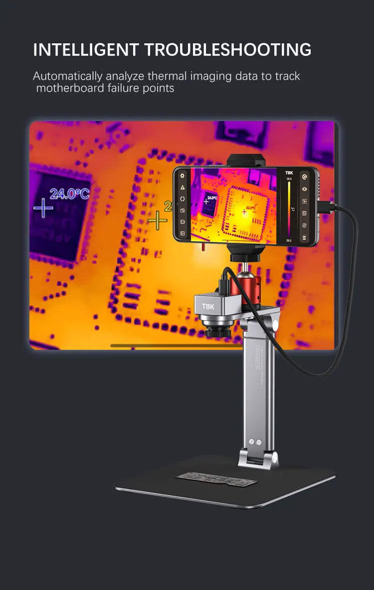 كاميرا حرارية احترافية من TBK مزودة بتقنية الأشعة تحت الحمراء لتحديد الأعطال الحرارية على لوحات الموبايل. تساعد الفنيين في كشف نقاط السخونة والمشاكل بدقة وسرعة أثناء الصيانة.